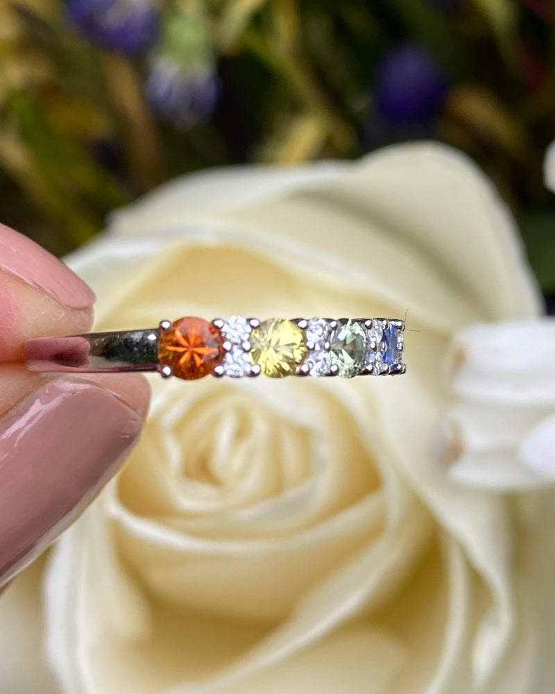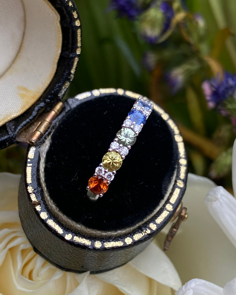 This stunning 18ct White Gold half eternity ring contains a vibrant rainbow of multi-coloured Sapphires, perfectly offset by the sparkling Diamonds set in-between each of the gemstones. The ring contains seven Sapphires each individually set in a fine claw setting, including orange, yellow, mint, blue and pink colours, and coming to a total weight of approximately 1.08ct. The Brilliant Cut Diamonds are great quality, very nice and bright with a good G colour and VS clarity, and weigh 0.14ct in total. This is a lovely quality half eternity ring set entirely in 18ct White Gold. The perfect gift for that special person, at a great price, and sure to be treasured for years to come.