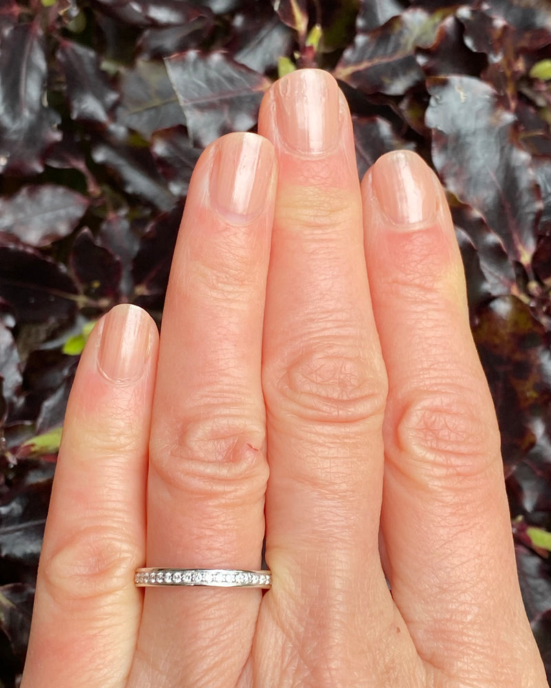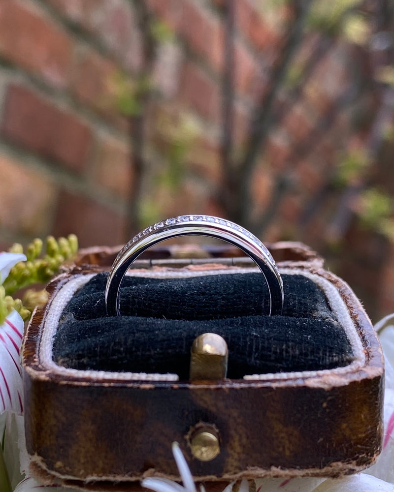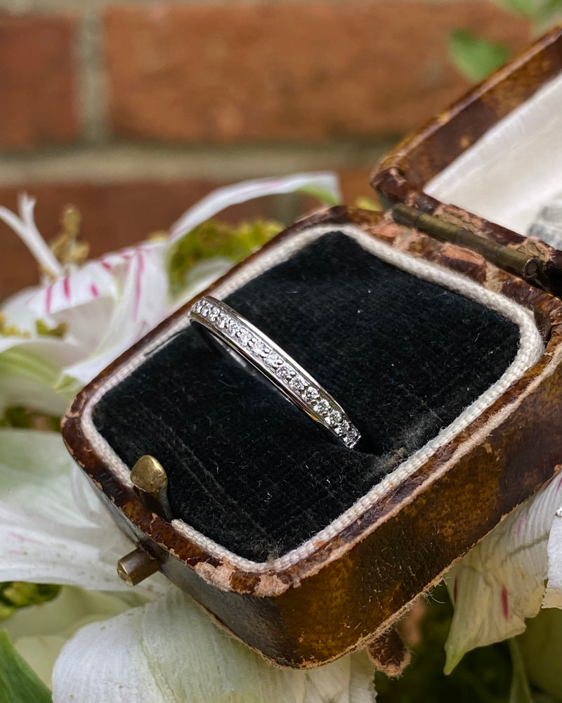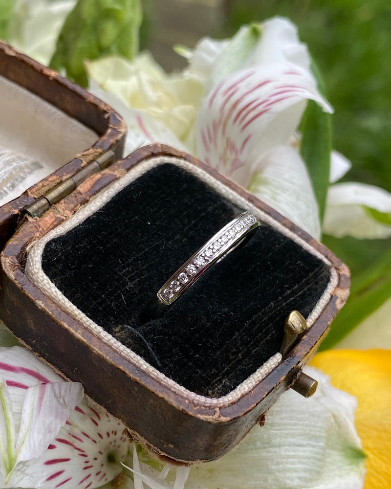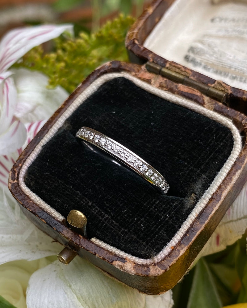 A fine quality half Eternity ring set with a seamless row of twenty one Pave Set sparkling Brilliant Cut Diamonds. The Brilliant Cut Diamonds are great quality, weigh 0.18ct, approximately G/H colour and VS/SI clarity and are set in a 2.2mm contemporary soft Court Shape 18ct White Gold band. This is a lovely quality half eternity ring or could be a used as a Wedding set band for that special person, at a great price.