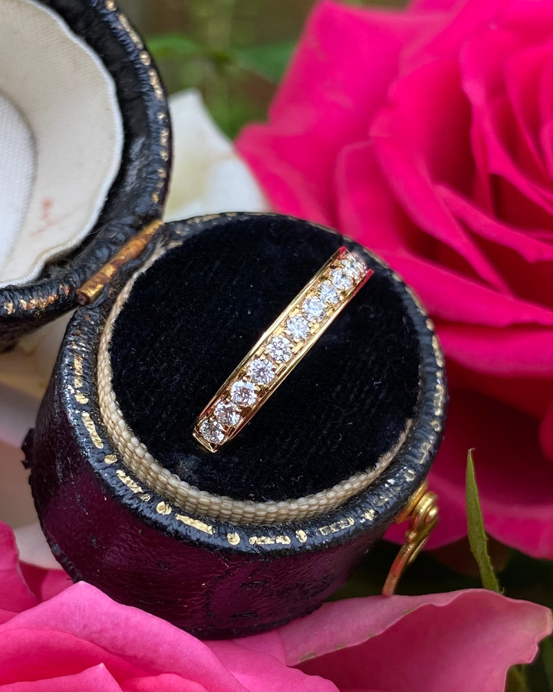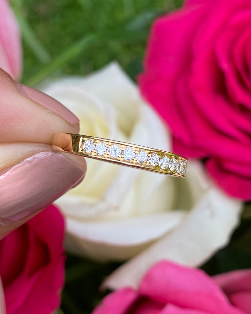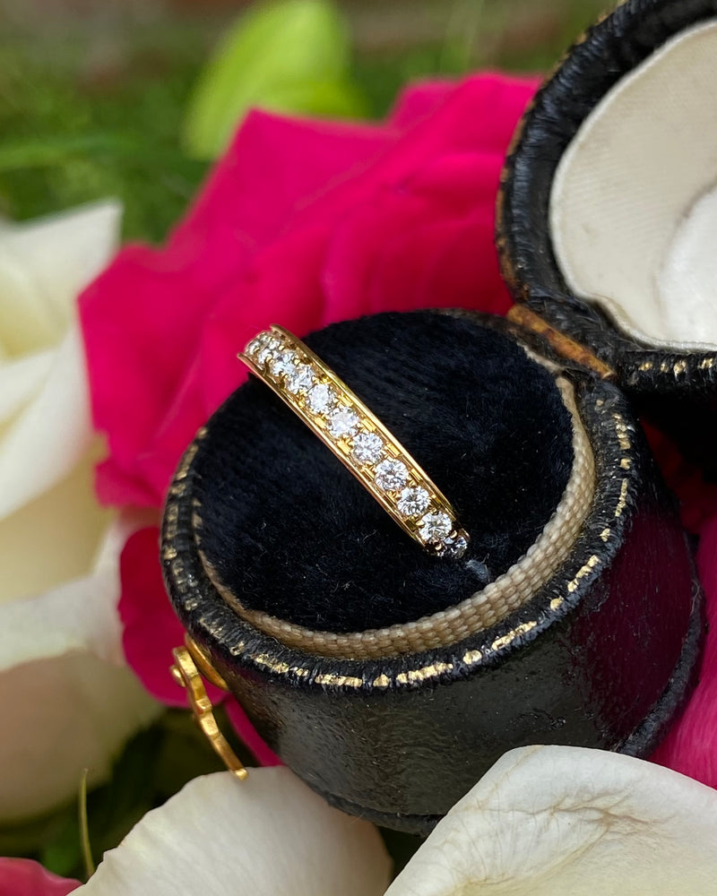 A fine quality half Eternity ring set with a seamless row of seventeen Pave Set sparkling Brilliant Cut Diamonds. The Brilliant Cut Diamonds weigh 0.37ct - are great quality, approximately G colour and VS/SI clarity, and are set in a 2.8mm contemporary Court Shape 18ct Yellow Gold band. This is a lovely quality half eternity ring or could be a used as a Wedding set band for that special person, at a great price. This ring is sure to be treasured for years to come.