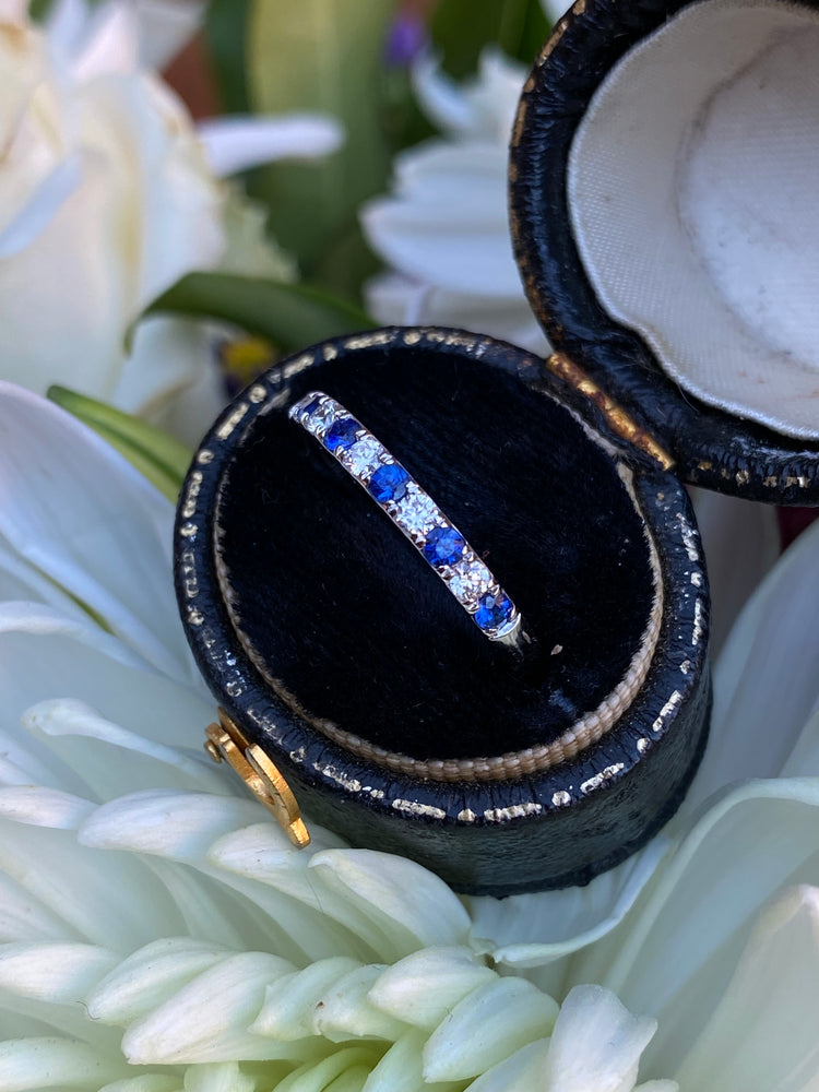 A beautiful 18ct White Gold Half Eternity Ring, containing an alternating row of six Sapphires and five Diamonds each individually set in a fine claw setting. The Round Cut Sapphires are a gorgeous cornflower blue Sapphire of a fine colour and clarity, and weigh 0.28ct in total. Perfectly offsetting these stunning stones are Round Brilliant Cut Diamonds set in-between each of the Sapphires, which are fantastic bright stones with no marks visible to the naked eye, approximately 'G' colour and 'VS' clarity and sparkle beautifully. The ring contains a total Diamond weight of 0.17ct and is set entirely in 18ct White Gold - This really is a stunning ring!