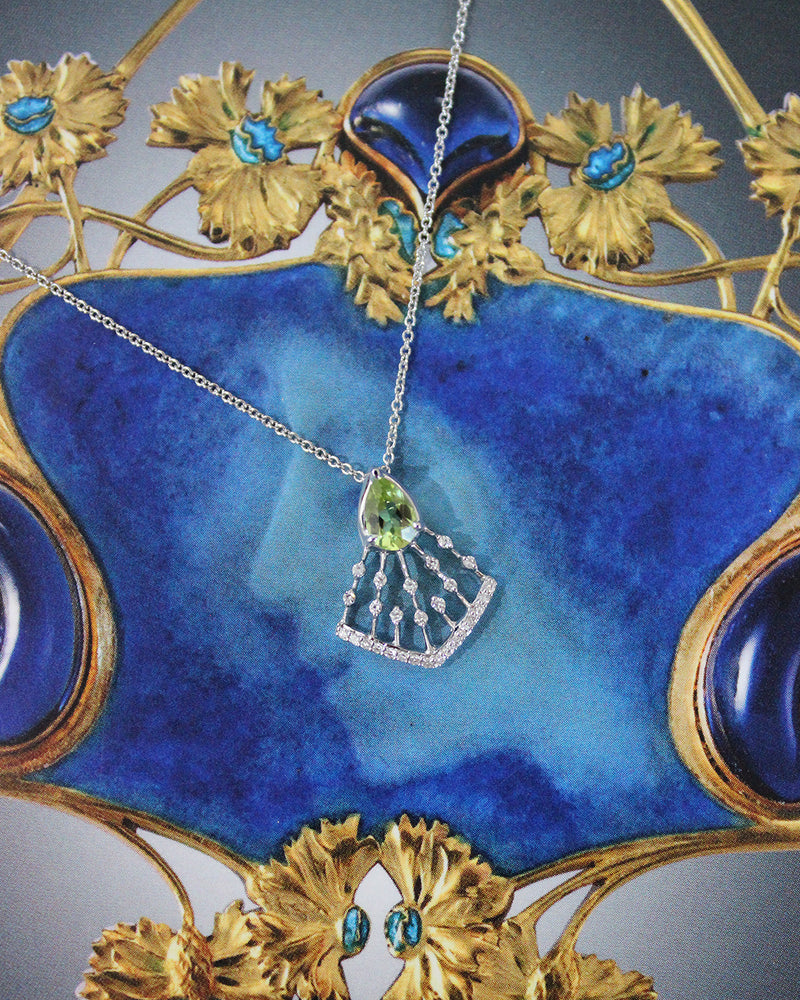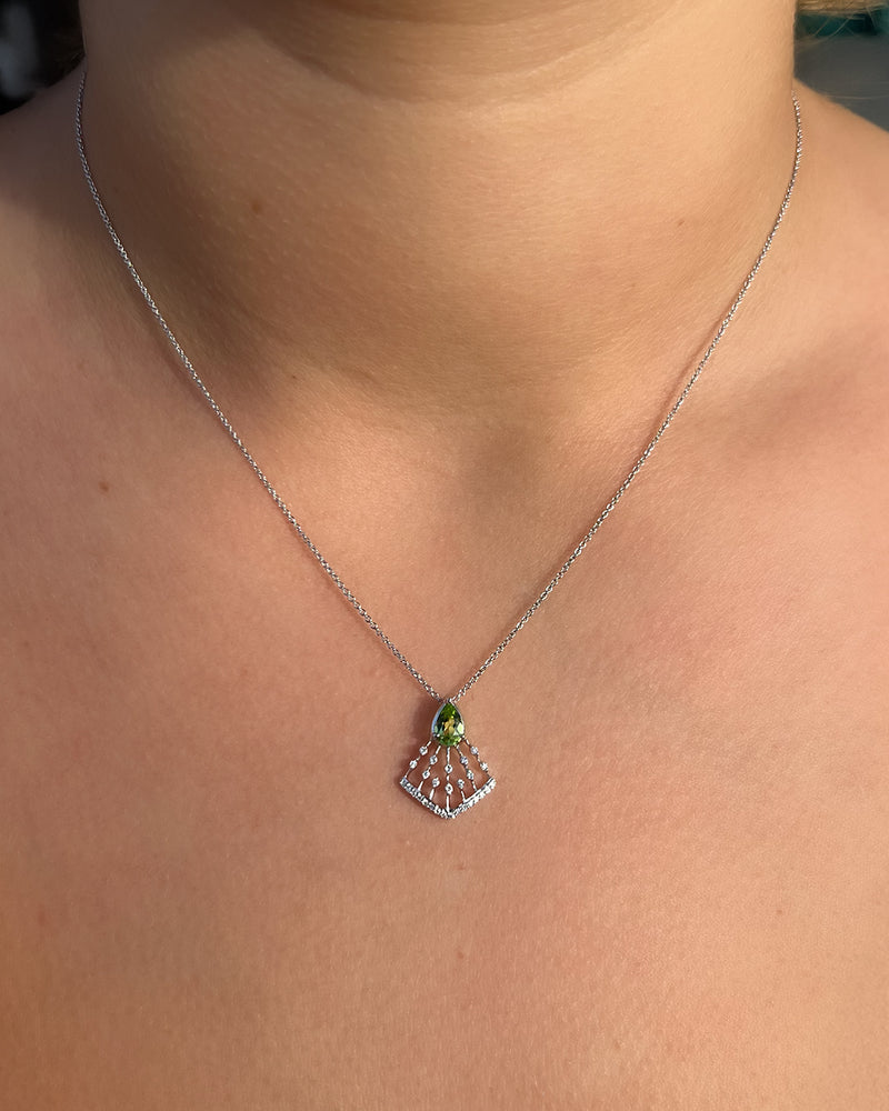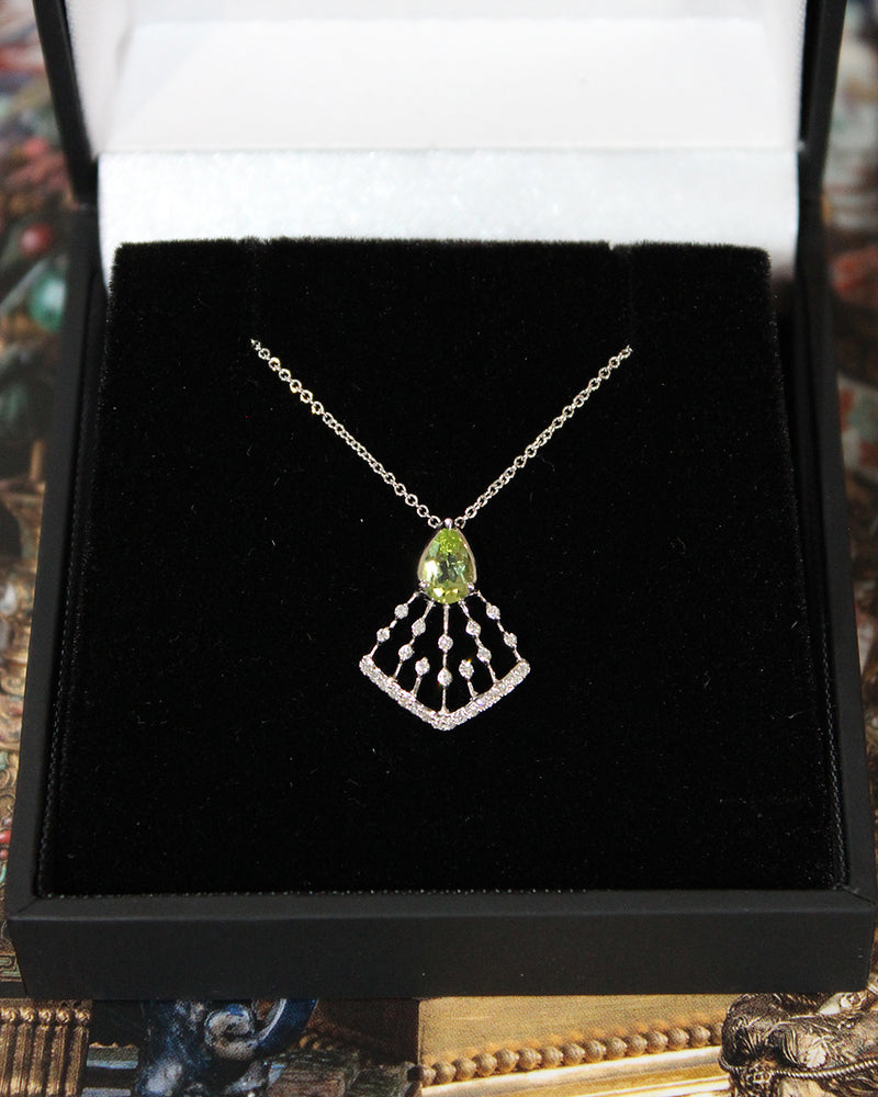 Art Deco Style Peridot and Diamond Drop Pendant 18ct White Gold 0.08ct + 0.40ct