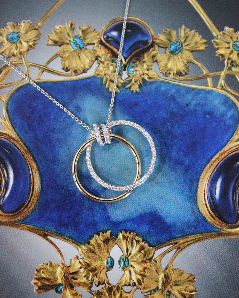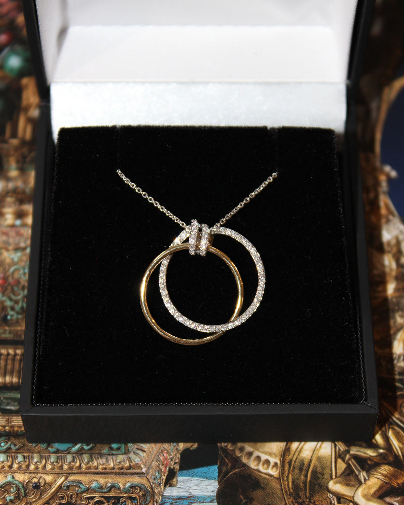 A lovely Contemporary Style Diamond Double Hoop Pendant, set in 18ct White Gold. The pendant contains a circle of Pave Set Round Brilliant Cut Diamonds on a beautiful 18ct White Gold circular design. To complete this gorgeous design, there is a further interlocking hoop made entirely in 18ct Yellow Gold, providing the ultimate contrast. The dazzling Diamonds are bright and lively stones of a fine 'G' colour and 'VS’ clarity that sparkle beautifully when worn and weigh a total of 0.26ct in Diamond weight. Each of the hoops measures 18.5mm round. The chain measures 16.5 inches and is also 18ct White Gold. This is a lovely design, suitable for any occasion!