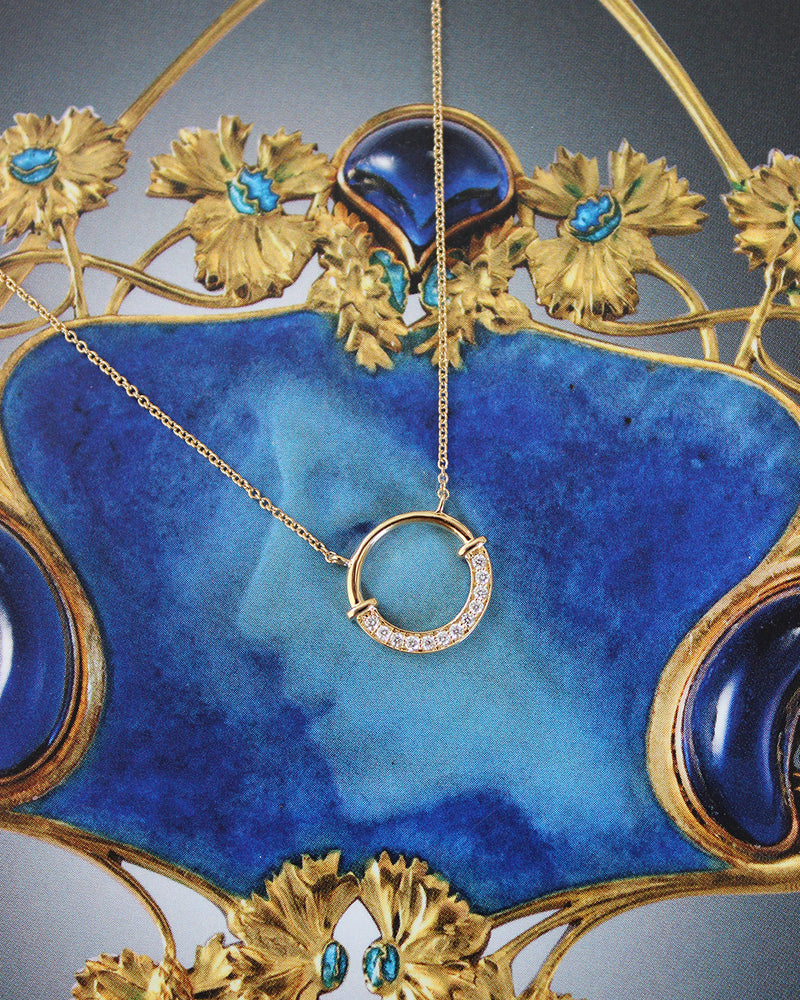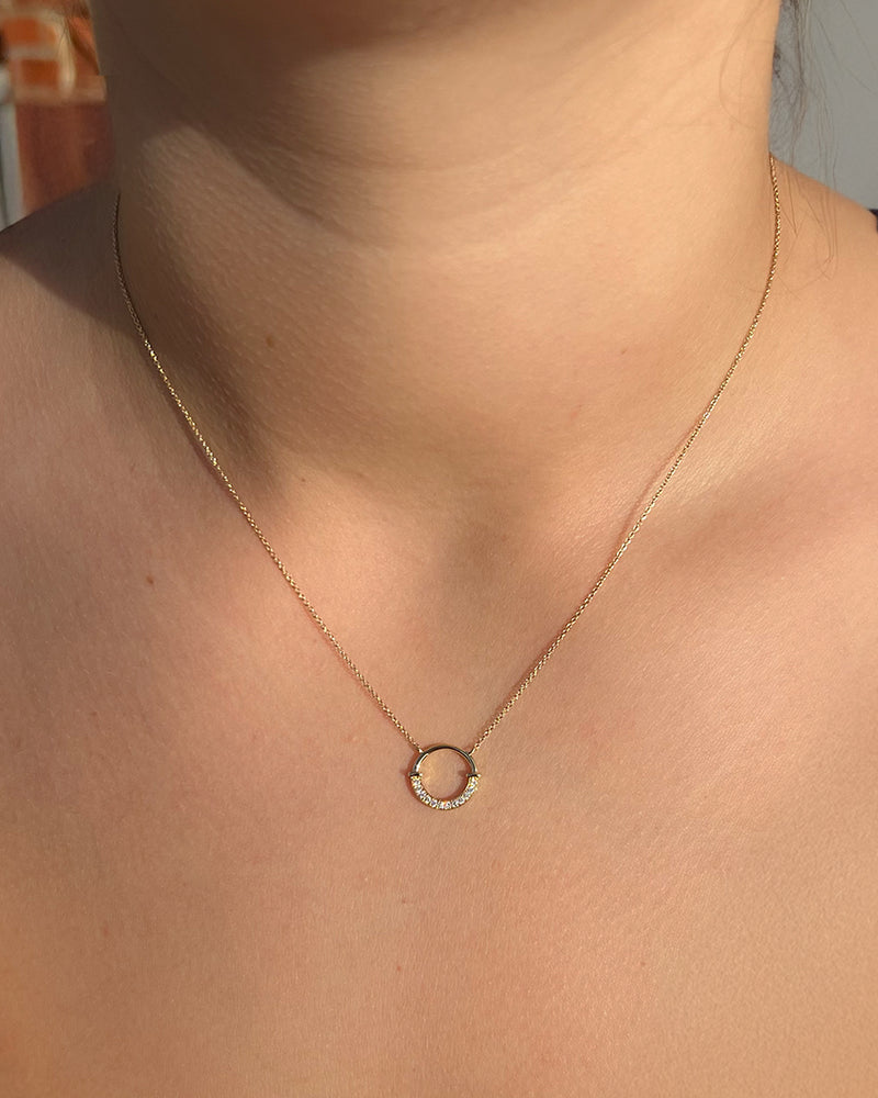 A stunning Contemporary Style Half Diamond Open Circle Pendant set entirely in 18ct Yellow Gold. The pendant features numerous Brilliant Cut Diamonds Pave Set halfway around a beautiful circular design. The dazzling Diamonds are bright and lively stones of a fine 'G' colour and 'VS' clarity that sparkle beautifully when worn and weigh a total of 0.08ct in Diamond weight. The pendant measures 12mm round at its widest point is made entirely in 18ct Yellow Gold. The chain measures 16.5 inches and is also 18ct Yellow Gold. This is a lovely eye-catching design, suitable for any occasion!