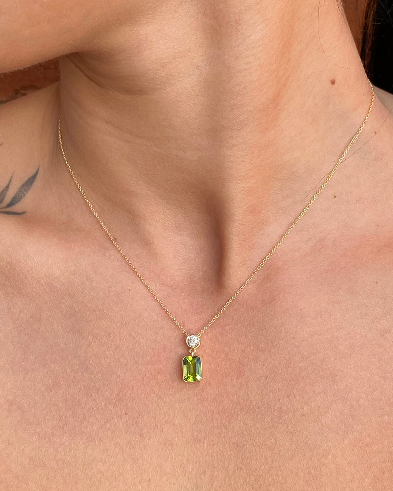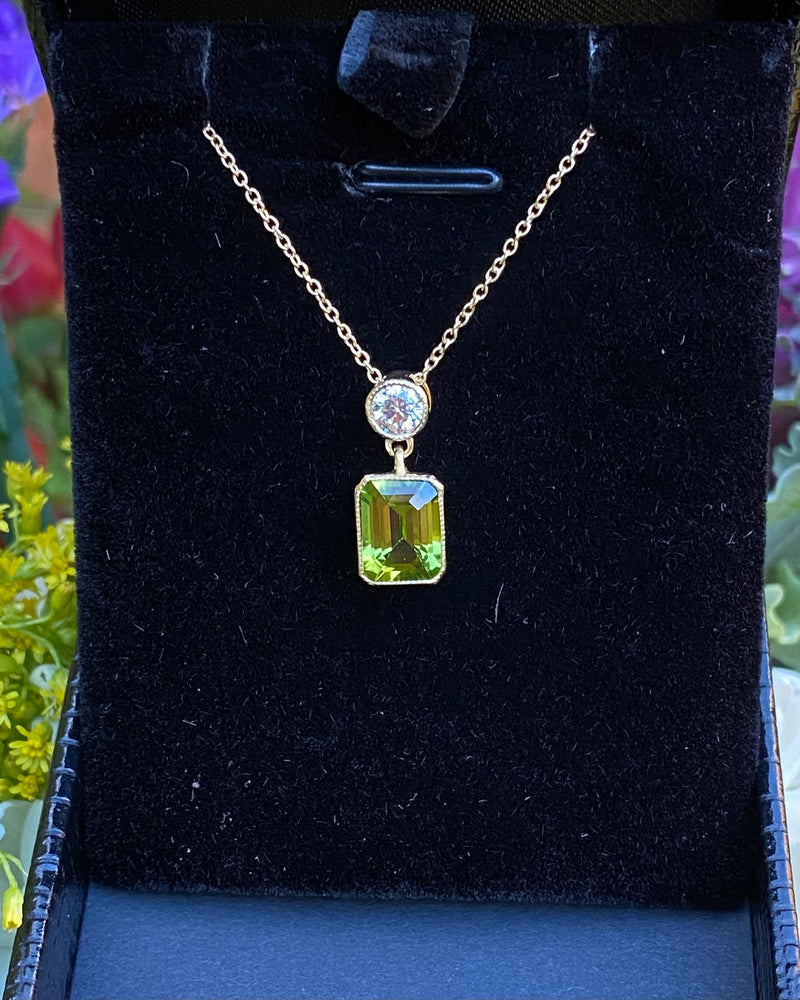 Love this Peridot and Diamond pendant! It's just so elegant! The Peridot is a beautiful spring green colour and is perfectly complemented by the rub over set Brilliant Cut Diamond. Both are joined by an articulated link, creating lovely movement when worn. The Brilliant Cut Diamond weighs 0.30ct, is bright and clean, I colour and VS/SI1 clarity. The Peridot weighs 1.75ct and measures 8.5mm x 6.5mm. The pendant comes on a 16 inch 18ct Yellow Gold chain. This is a very stylish and versatile pendant and could be worn dressed up or down.
