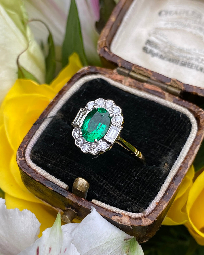 Art Deco Emerald and Diamond Cluster Ring 18ct Yellow Gold 0.50ct + 1.10ct