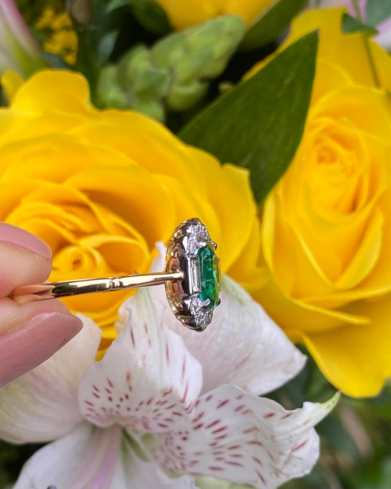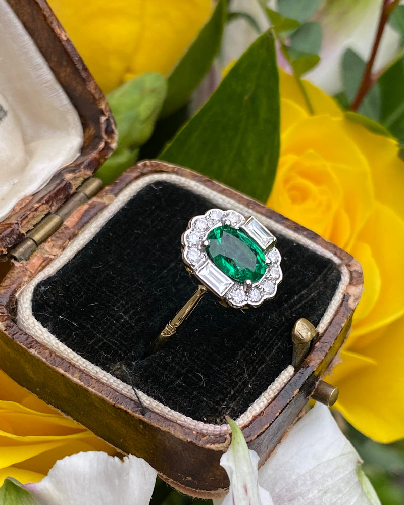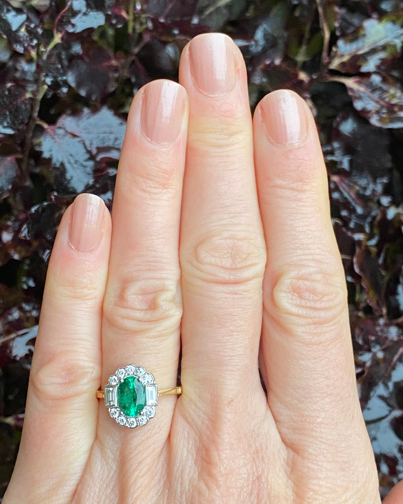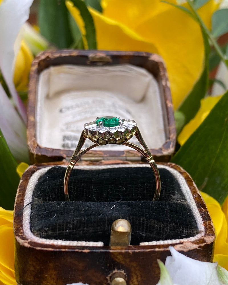 A beautiful Art Deco style Emerald and Diamond Cluster Ring set in 18ct Yellow Gold. The beautiful rich green Emerald measures 8mm x 6mm, weighs 1.10ct and is of exceptional colour and clarity. The Emerald is Oval Cut and set in a four-claw setting, complimented beautifully by the ten surrounding Pave set Round Brilliant Cut Diamonds and an additional single Baguette Cut Diamond either side, coming to a total Diamond weight of 0.50ct in the ring. The Diamonds are bright stones with no marks visible to the naked eye, approximately VS/SI clarity and H/I colour and sparkle beautifully. The ring is set in 18ct Yellow Gold, with the head of the ring being set in heavy, high quality Platinum. This really is a stunning example of an Emerald and Diamond Cluster with the difference, the ratios just work so well together - simply a gorgeous ring!