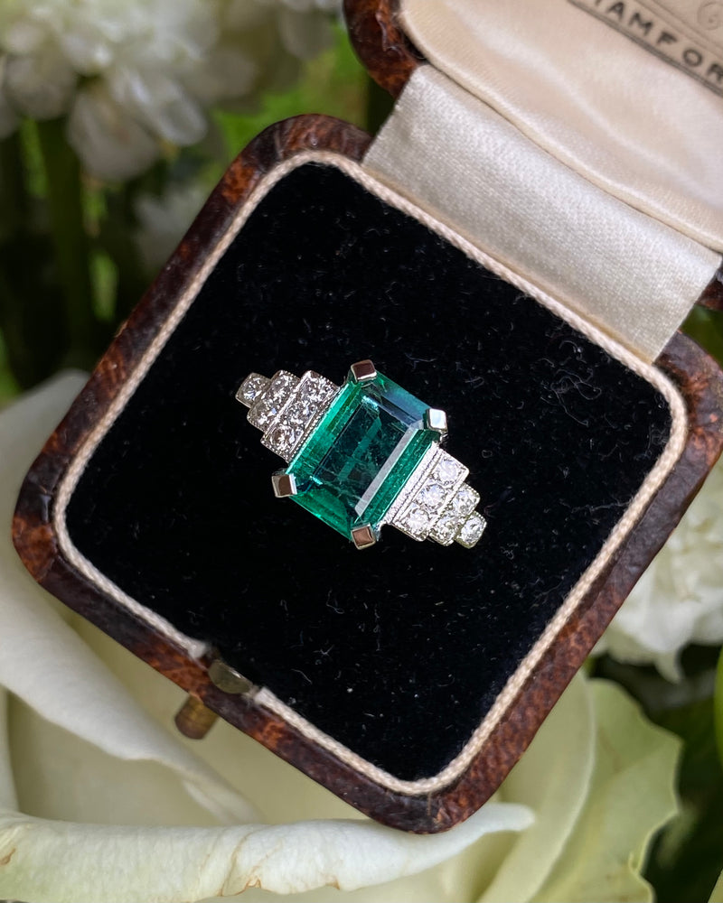 Art Deco Emerald and Diamond Platinum Ring 0.25ct + 1.70ct