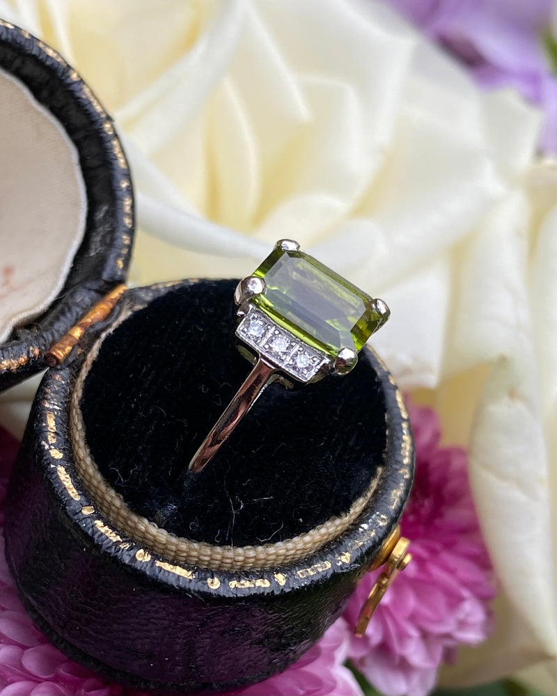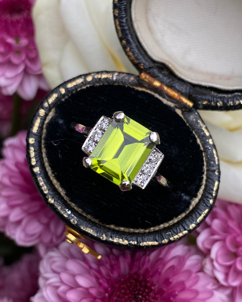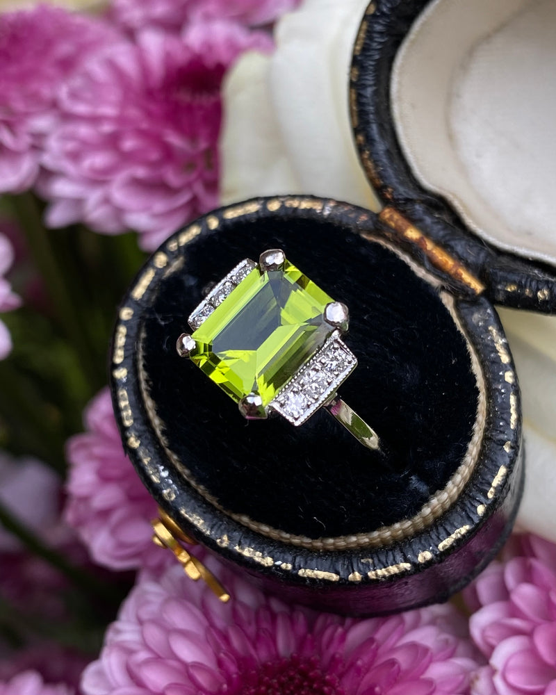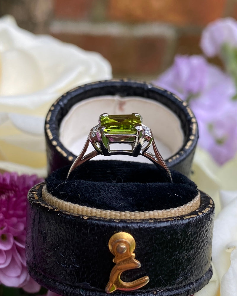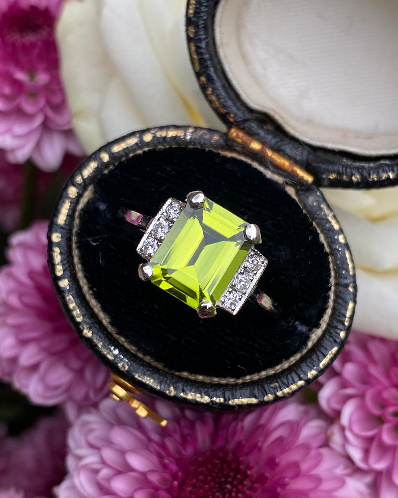 Art Deco Peridot and Diamond Platinum Ring 0.18ct + 2.30ct