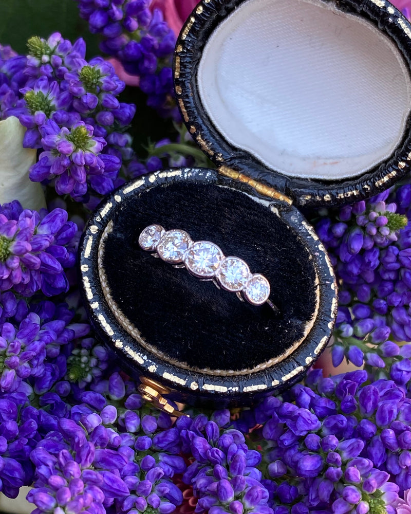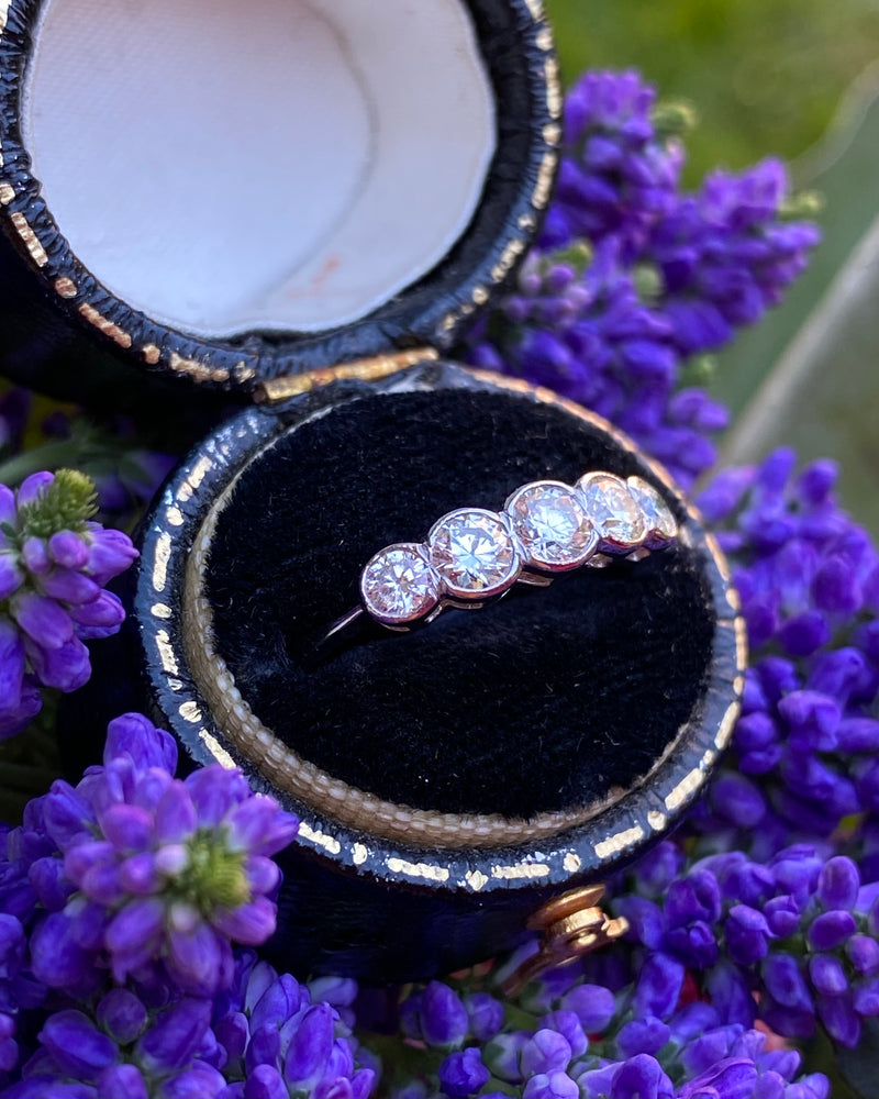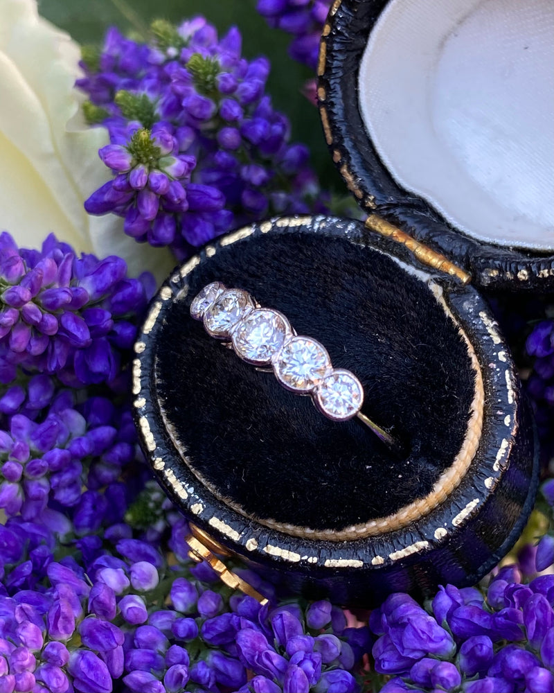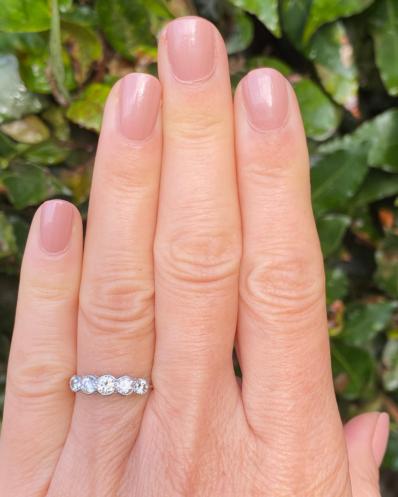 A beautiful Five Stone Rubover Setting Diamond Ring containing graduating Old Cut Diamonds of a great quality very nice and bright with a good H/I colour and VS/SI clarity overall. The stones weigh approximately 0.80ct in total Diamond weight and the ring is made entirely in Platinum with a traditional Rubover setting with milgrain edging. This ring is truly beautiful, with Diamonds that dazzle and sparkle brightly, this would make the perfect addition to any jewellery lover's collection!