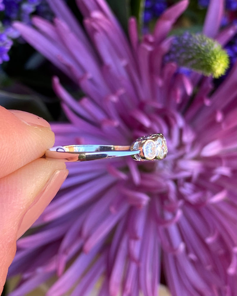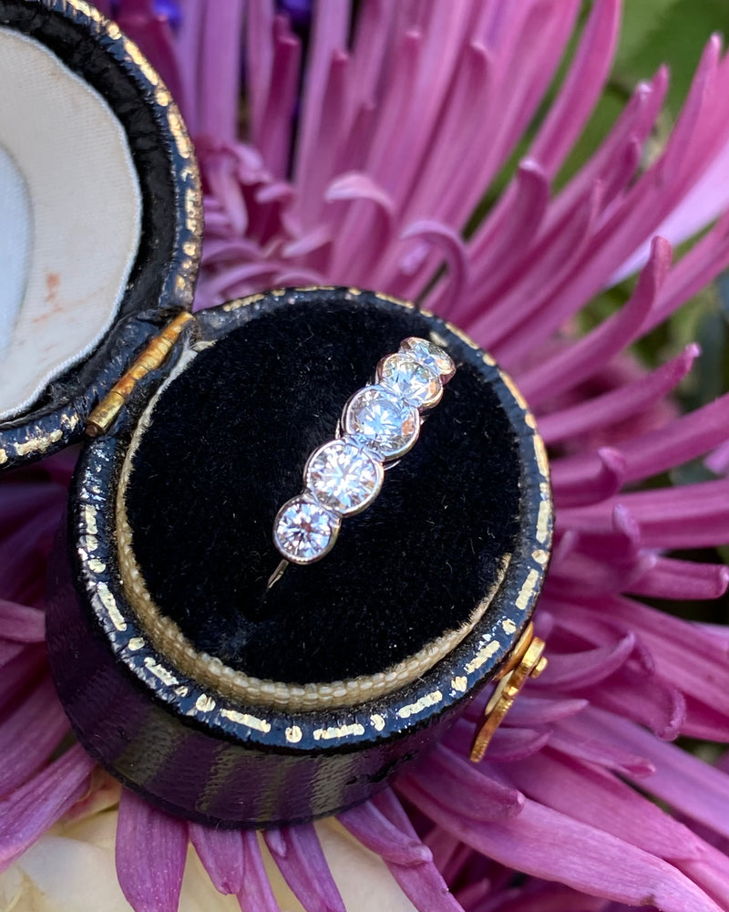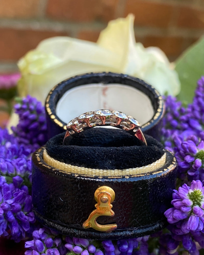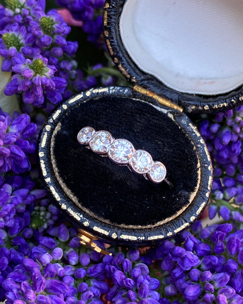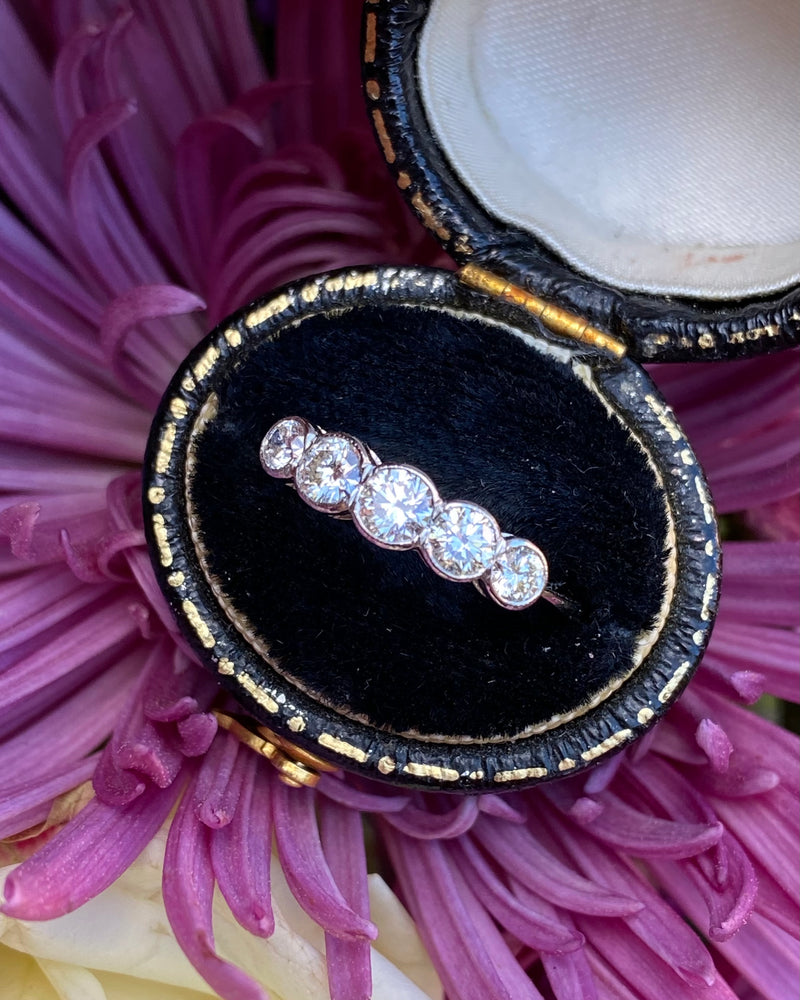 A beautiful Five Stone Rubover Setting Diamond Ring containing graduating Old Cut Diamonds of a great quality very nice and bright with a good H/I colour and VS/SI clarity overall. The stones weigh approximately 0.80ct in total Diamond weight and the ring is made entirely in Platinum with a traditional Rubover setting with milgrain edging. This ring is truly beautiful, with Diamonds that dazzle and sparkle brightly, this would make the perfect addition to any jewellery lover's collection!