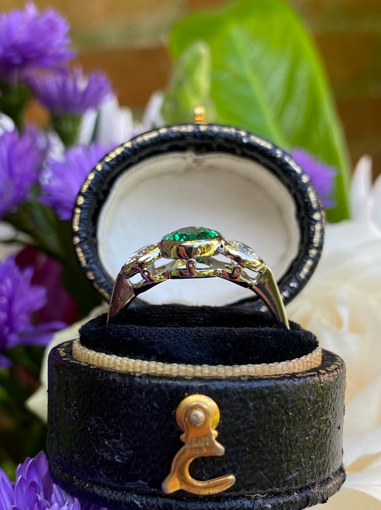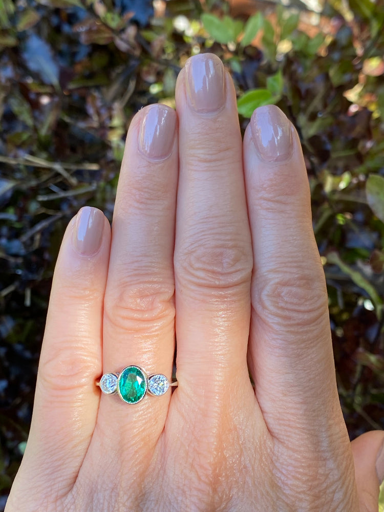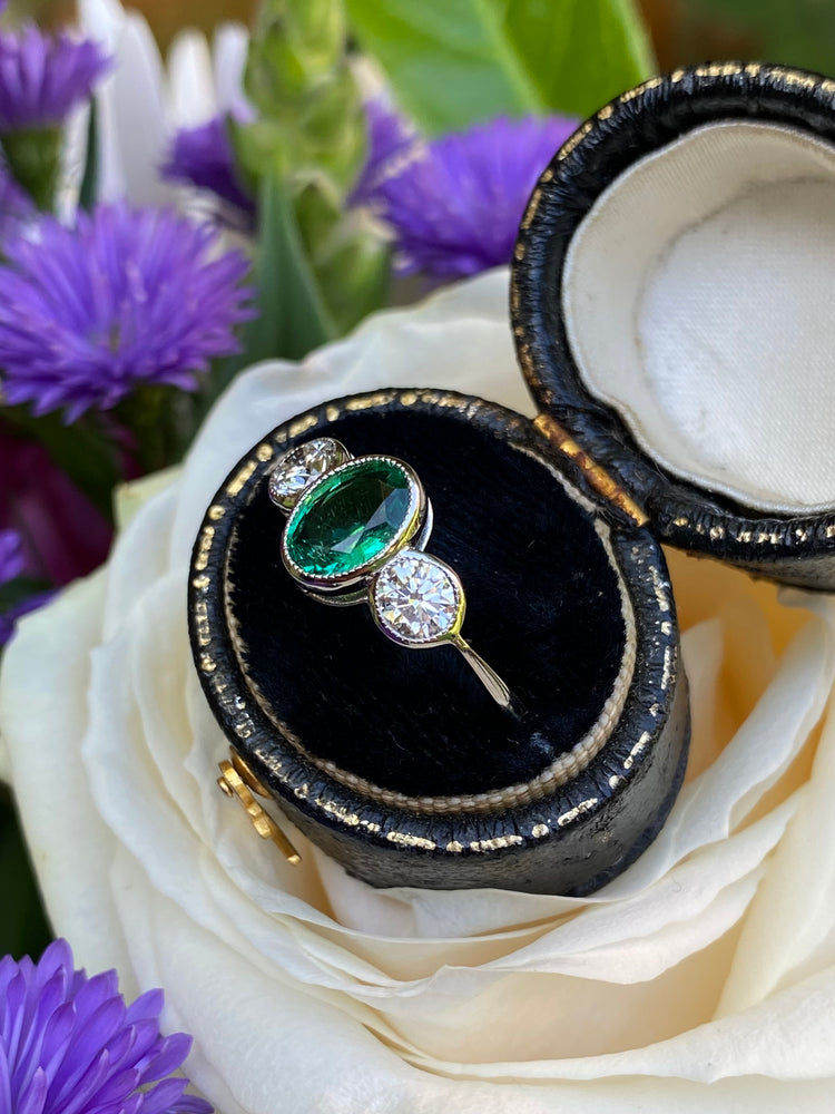 A lovely Emerald and Diamond Three Stone Ring containing a central Oval Cut Emerald with a gorgeous verdant grassy green colour of fine clarity, set in a rubover style with milgrain edging. In addition to this stunning stone are dazzling Brilliant Cut Diamonds set either side weighing approximately 0.75ct in total. The Diamonds are nice and bright stones with no marks visible to the naked eye, approximately I/J colour, VS/SI clarity and sparkle beautifully. The beautiful central Emerald weighs approximately 1.20ct and measures 8mm by 6mm, it looks beautiful when worn and sits nice and low on the finger - this is a truly stunning ring that is perfect for all occasions!