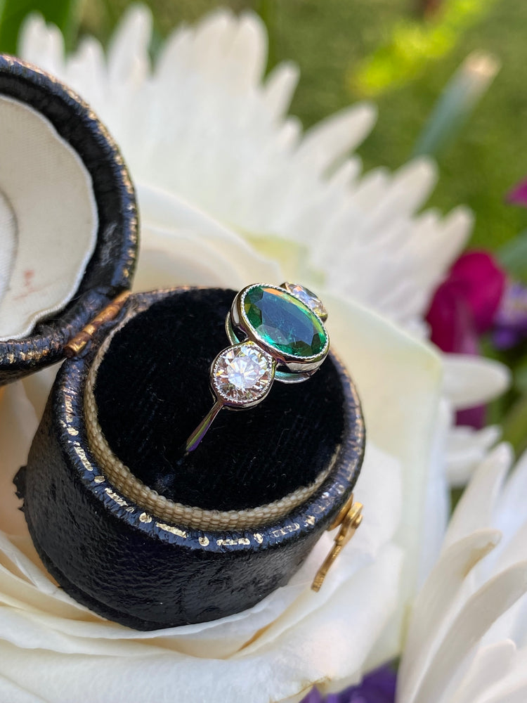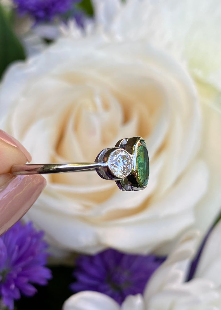 Emerald and Diamond Three Stone Platinum Ring 0.75ct + 1.20ct