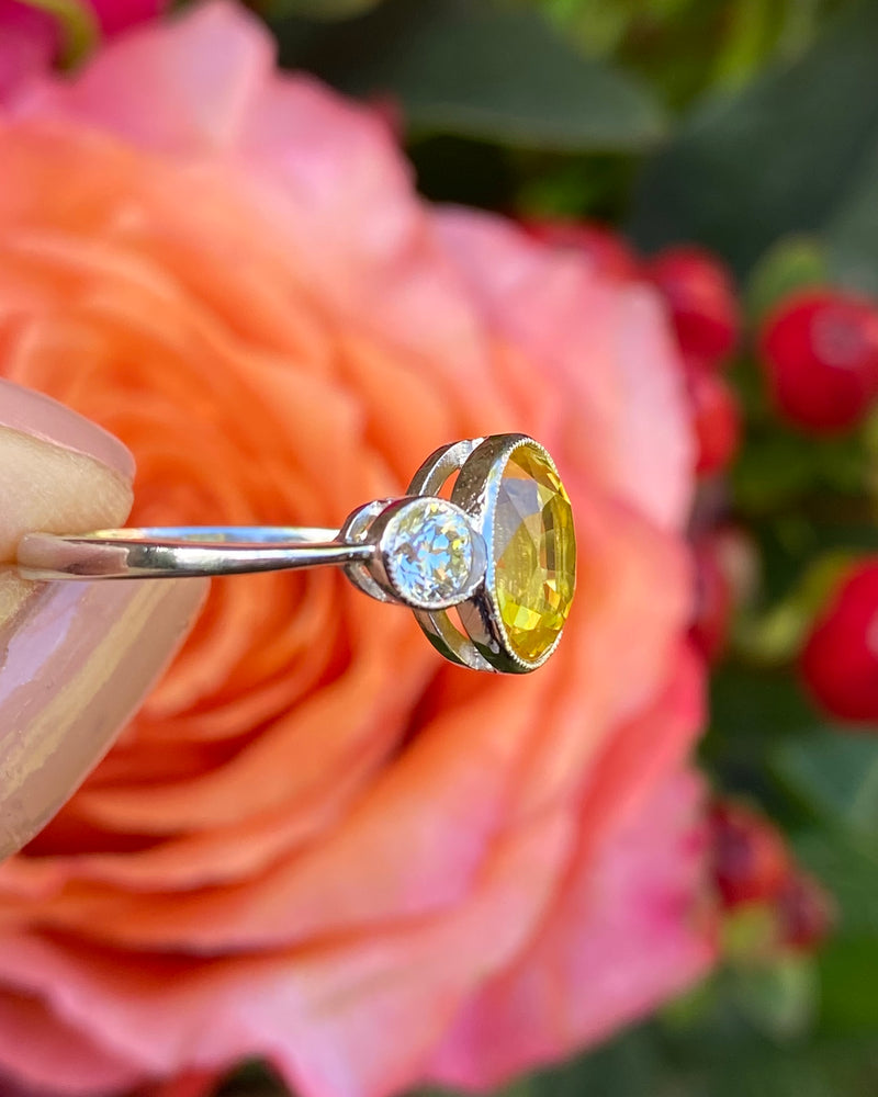 A classic with a twist, this stylish Yellow Sapphire and Diamond ring contains an Oval Yellow Sapphire measuring 9mm x 7mm and weighing 2.50ct. The Yellow Sapphire is a lovely sunshine yellow colour and is set in a rub over setting with a dazzling Diamond on either side. The Diamonds are of a fine 'I' colour and 'VS/SI" clarity, full of life and sparkle, weighing approximately 0.44ct in total Diamond weight, and provide the perfect contrast to the Yellow Sapphire!