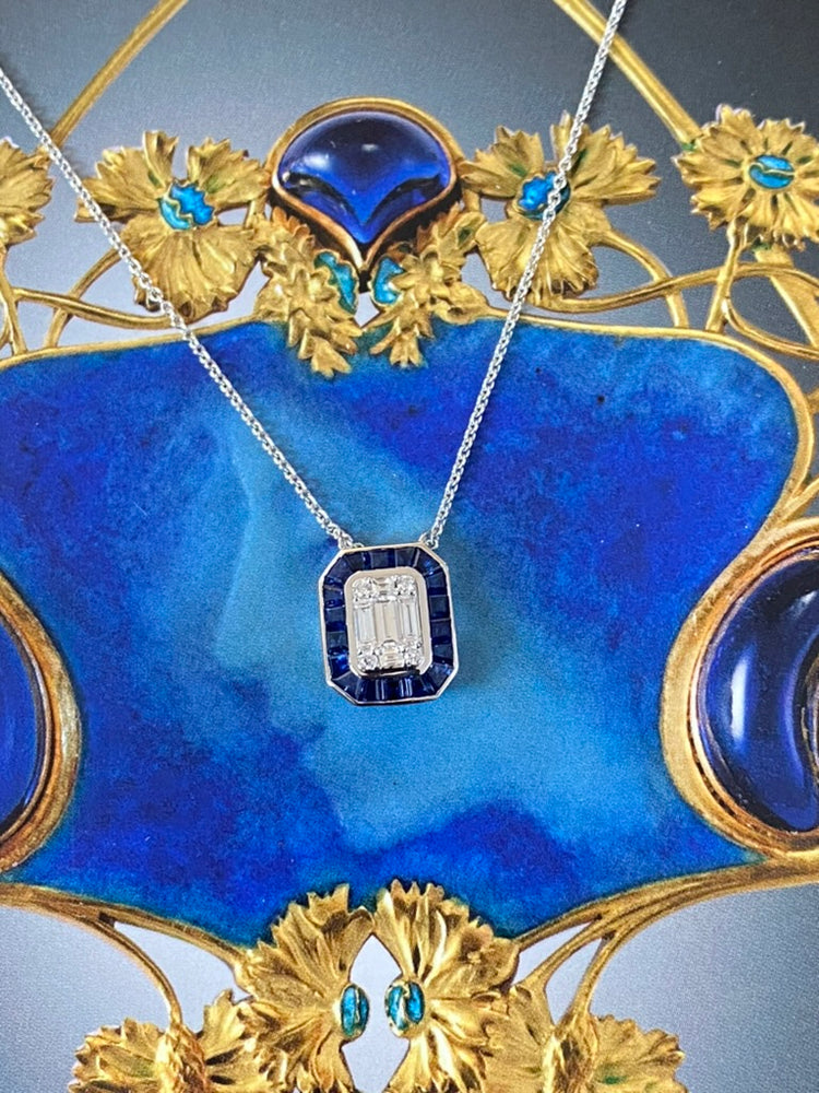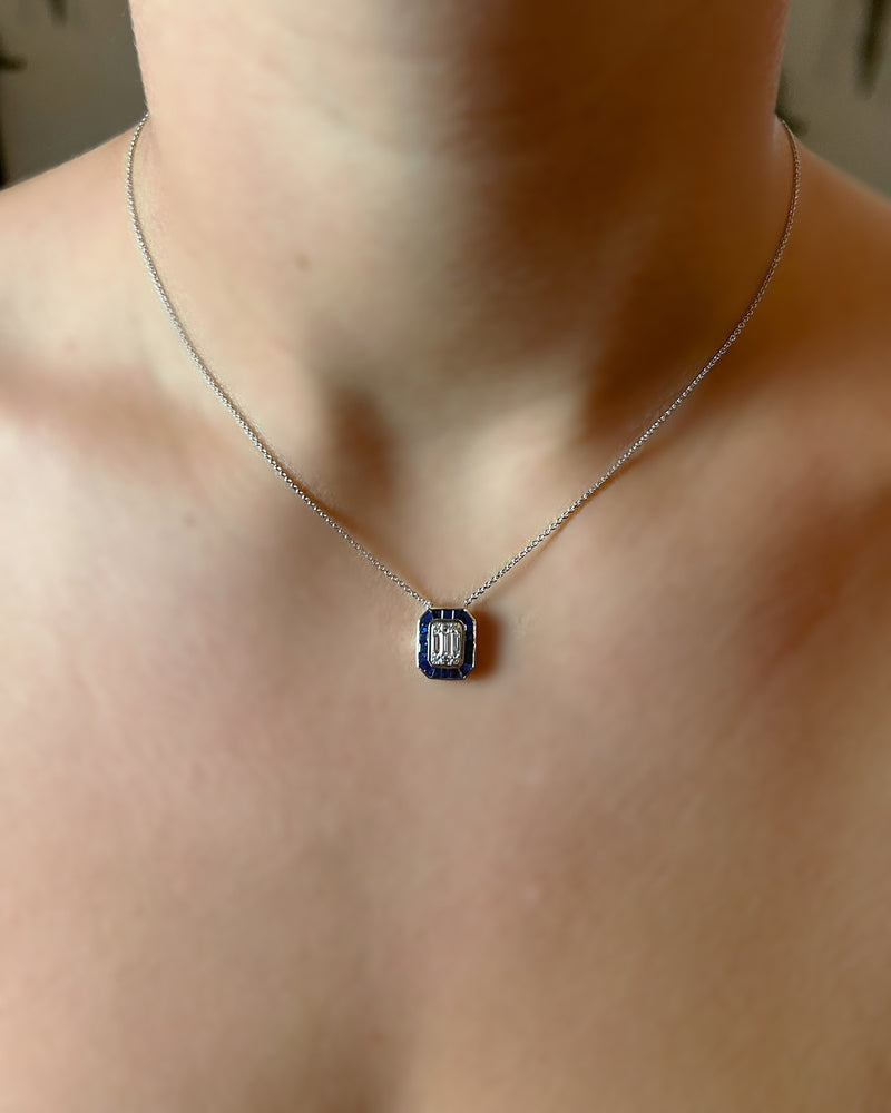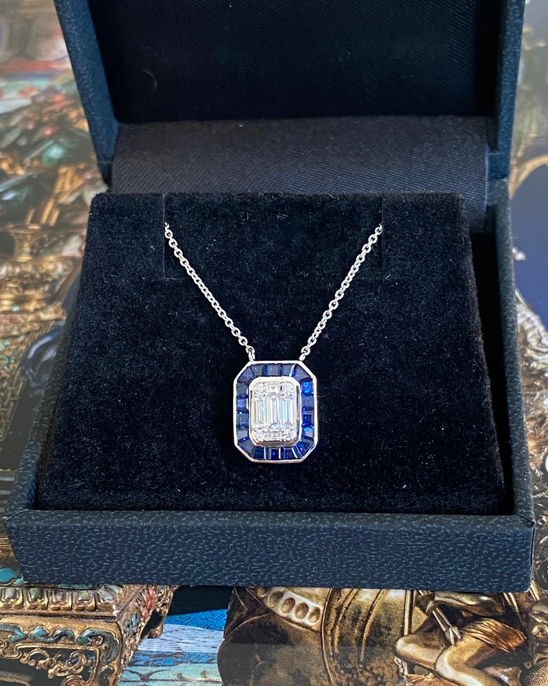 Art Deco Style Sapphire and Diamond Pendant 0.28ct + 0.89ct 18ct White Gold