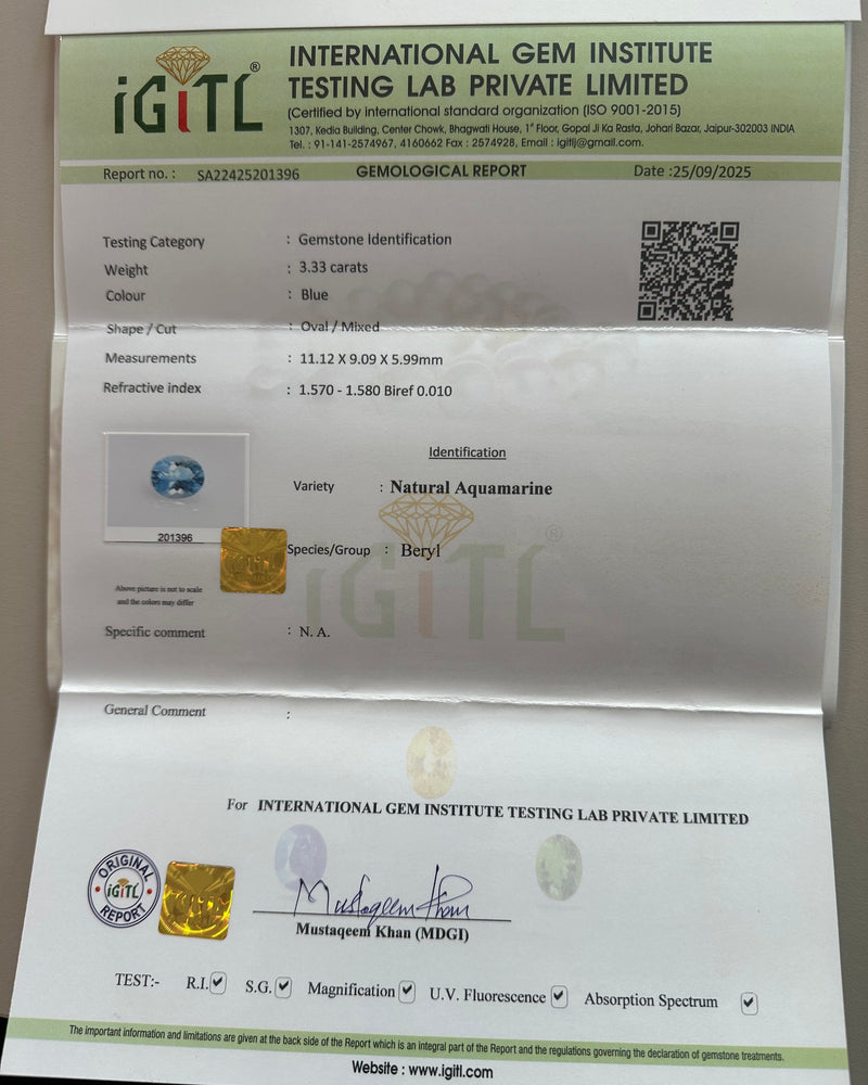 This is a stunning Aquamarine and Diamond Three Stone Ring with an intense baby blue colour Aquamarine, set with four claws with Brilliant Cut Diamonds set either side. The Diamonds weigh 1.02ct in total, are I colour, VS/SI clarity and are lovely bright and lively stones. The Aquamarine is certificated IGITL, weighing 3.33ct, measuring an impressive 11.12mm x 9.09mm x 5.99mm and is a lovely Oval cut shape set in a claw setting, beautifully offset by the Brilliant Cut Diamonds. This Aquamarine is fantastic quality, sky blue, saturated with colour, and the Diamonds are the ultimate compliment, to this stunning stone. The ring is made entirely in Platinum and is lovely quality.
