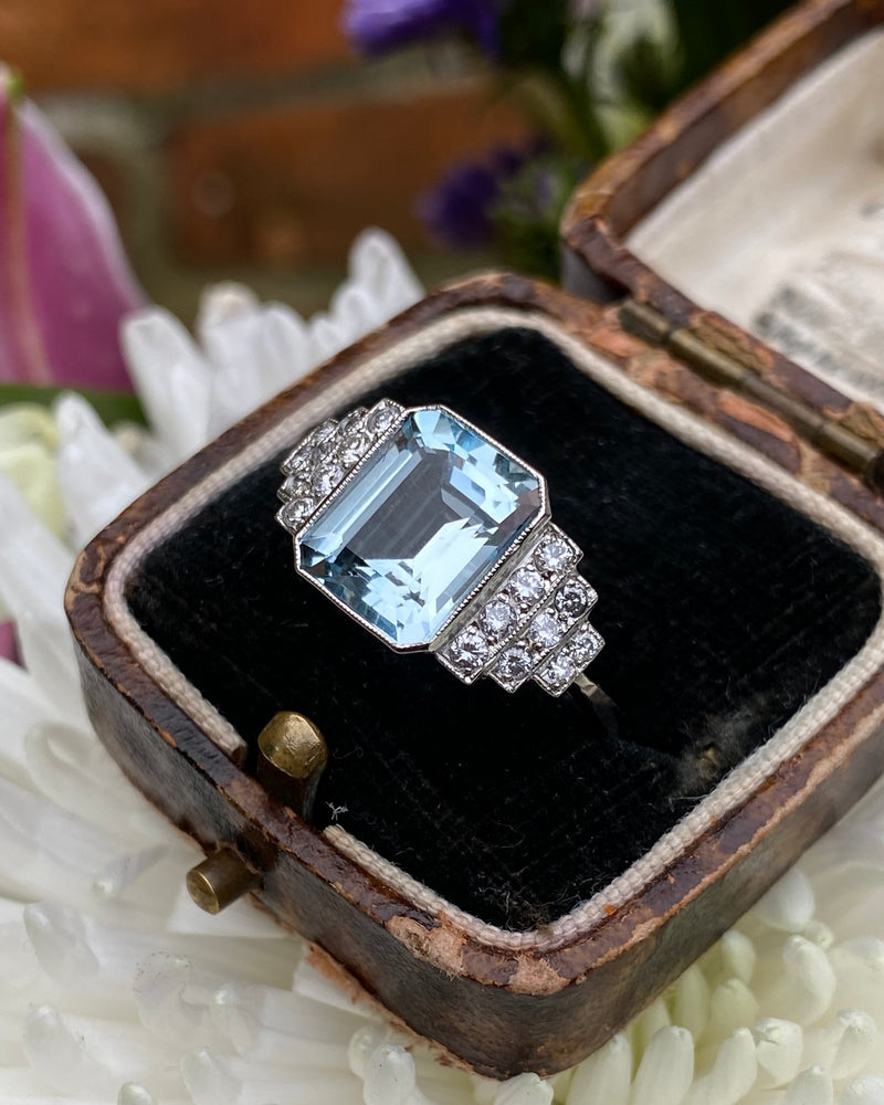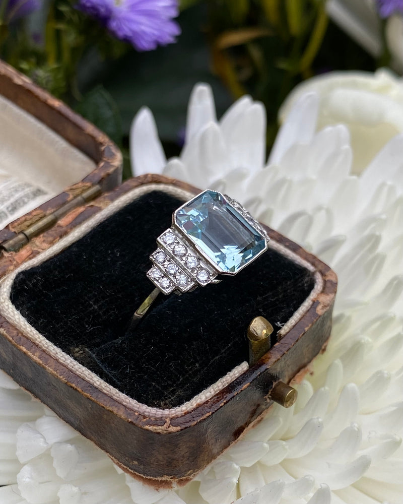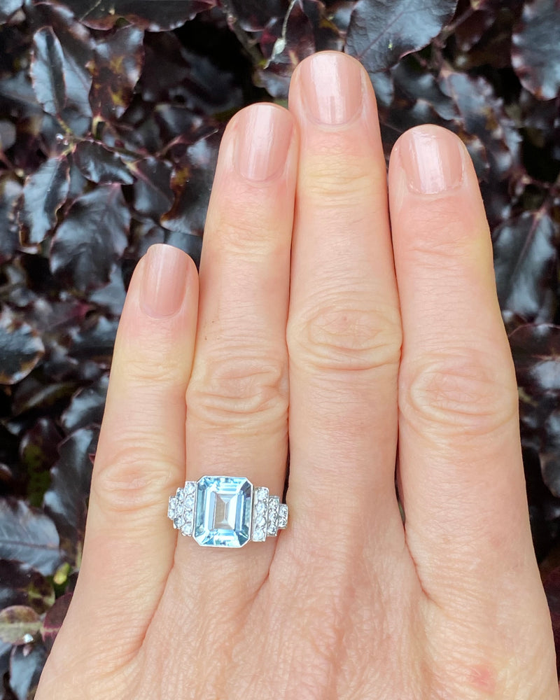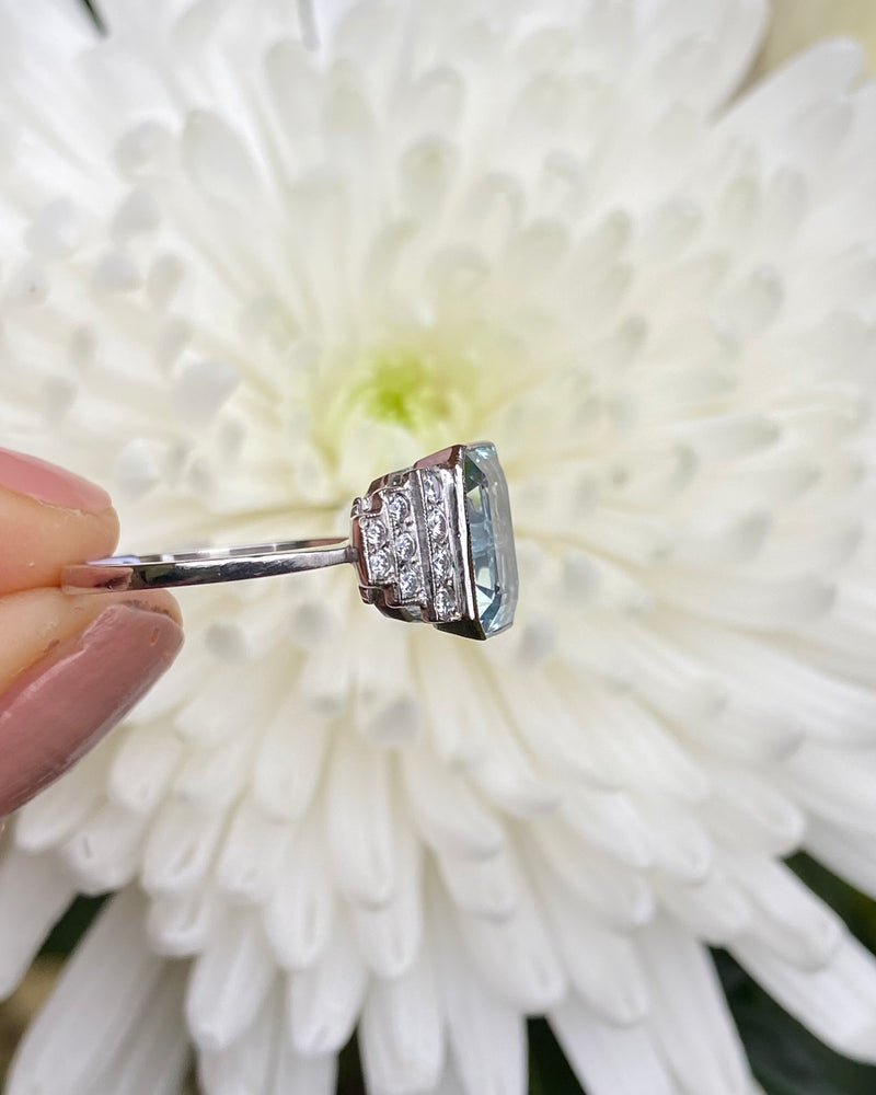 A stunning Art Deco style Aquamarine and Diamond ring with a fine quality sky blue Emerald Cut Aquamarine. The central Aquamarine and has been checked as weighing 3.20ct and measures 10.5 x 8.5mm. Set either side of this stunning stone are three rows of Brilliant Cut Diamonds which weigh 0.30ct in total. The Diamonds are H/I colour, VS/SI clarity and all finished with fine milgrain edging. The ring is made entirely in Platinum and can easily be sized to other measurements. This is excellent value for money for this lovely ring!