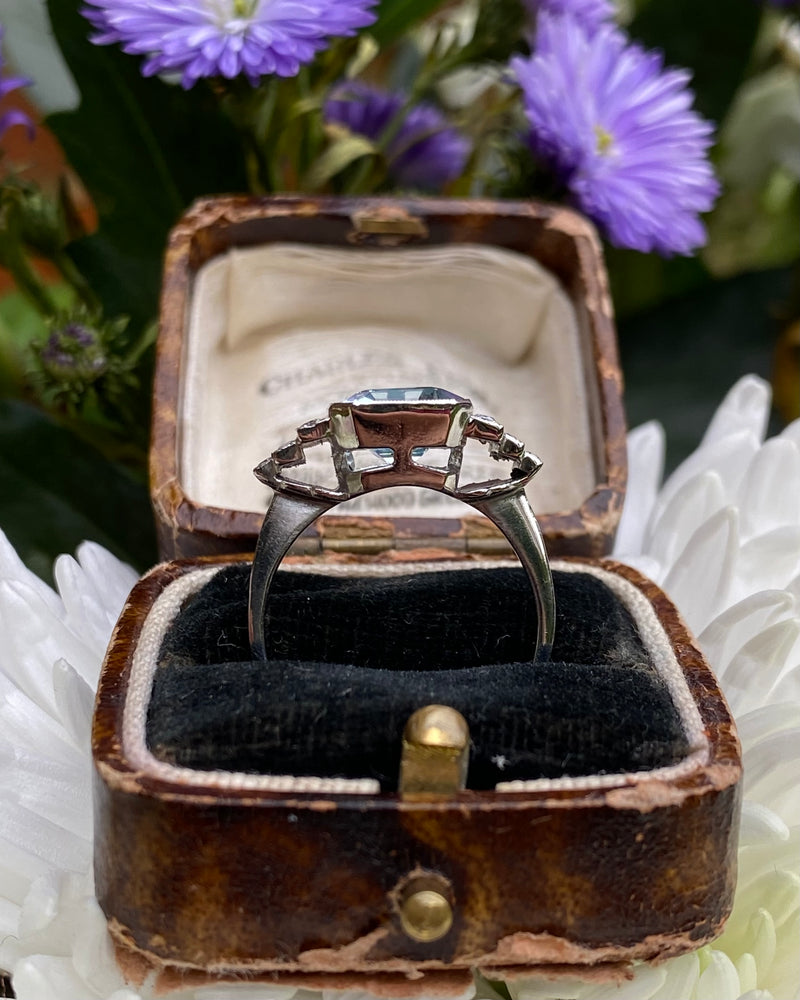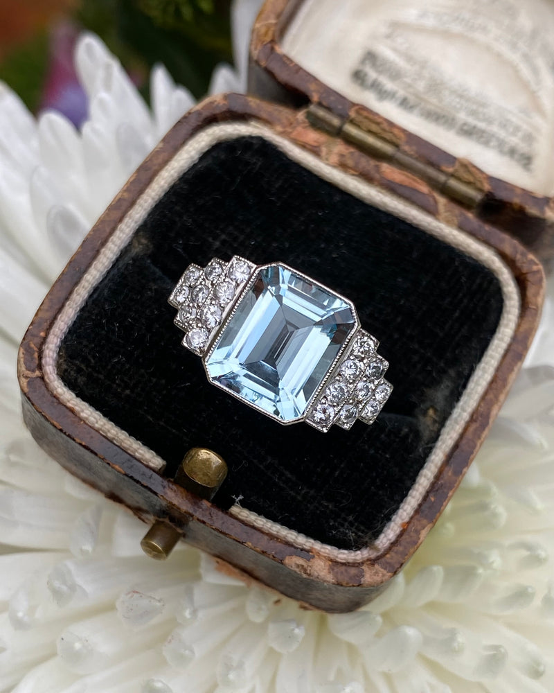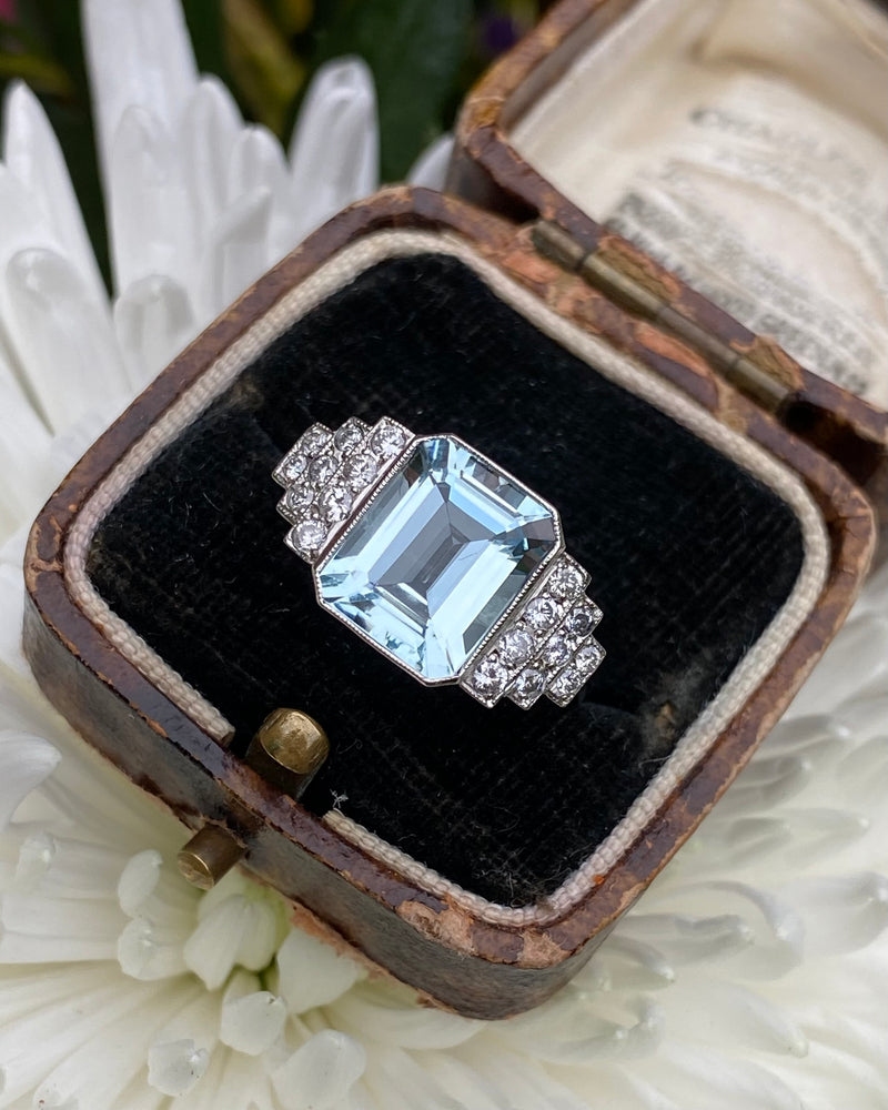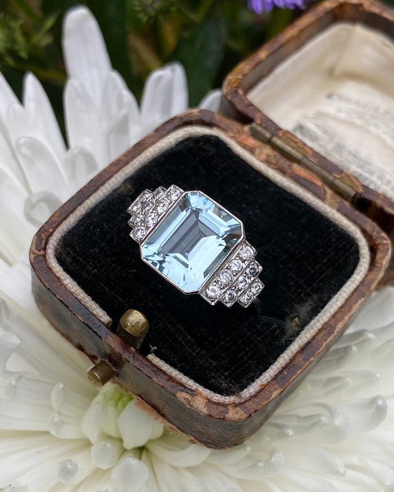 A stunning Art Deco style Aquamarine and Diamond ring with a fine quality sky blue Emerald Cut Aquamarine. The central Aquamarine and has been checked as weighing 3.20ct and measures 10.5 x 8.5mm. Set either side of this stunning stone are three rows of Brilliant Cut Diamonds which weigh 0.30ct in total. The Diamonds are H/I colour, VS/SI clarity and all finished with fine milgrain edging. The ring is made entirely in Platinum and can easily be sized to other measurements. This is excellent value for money for this lovely ring!