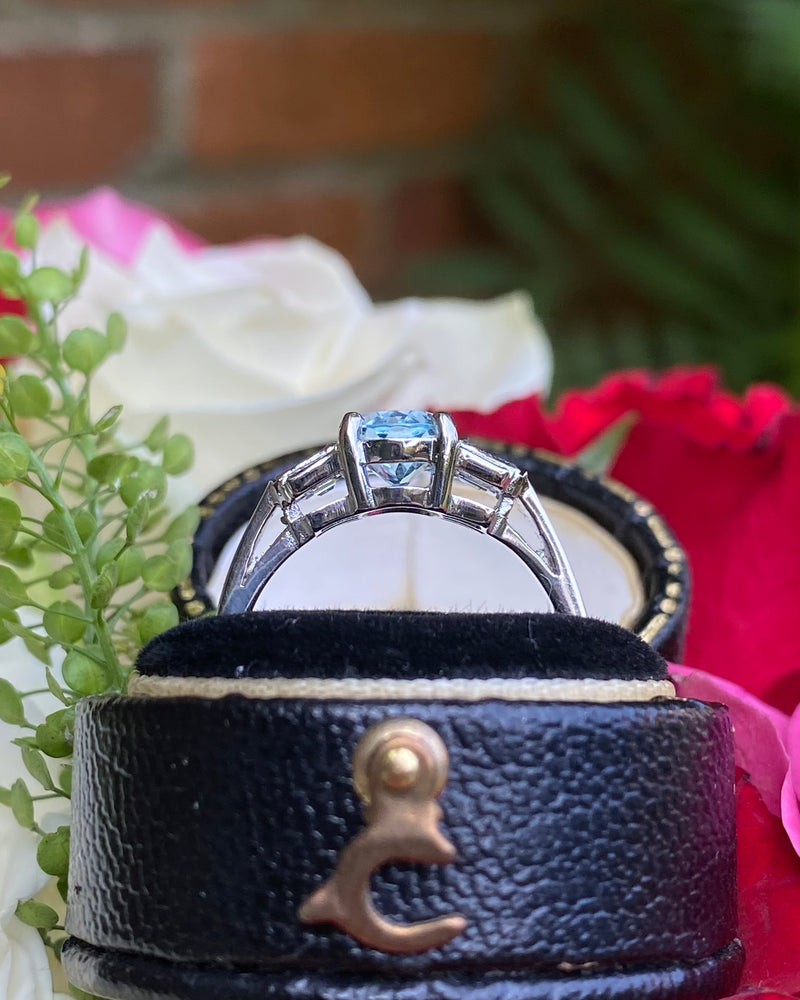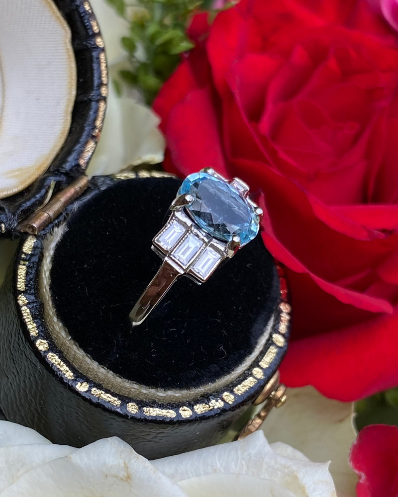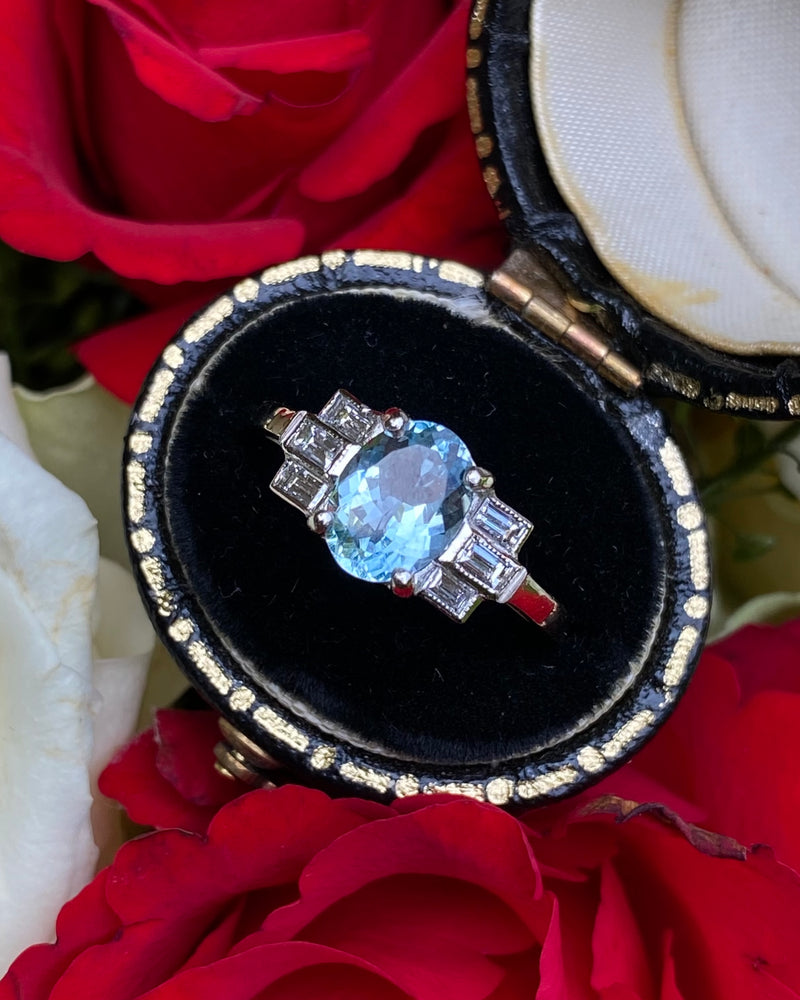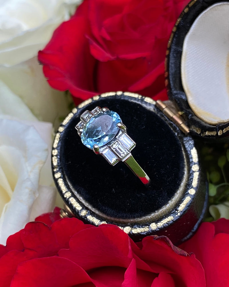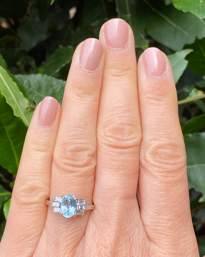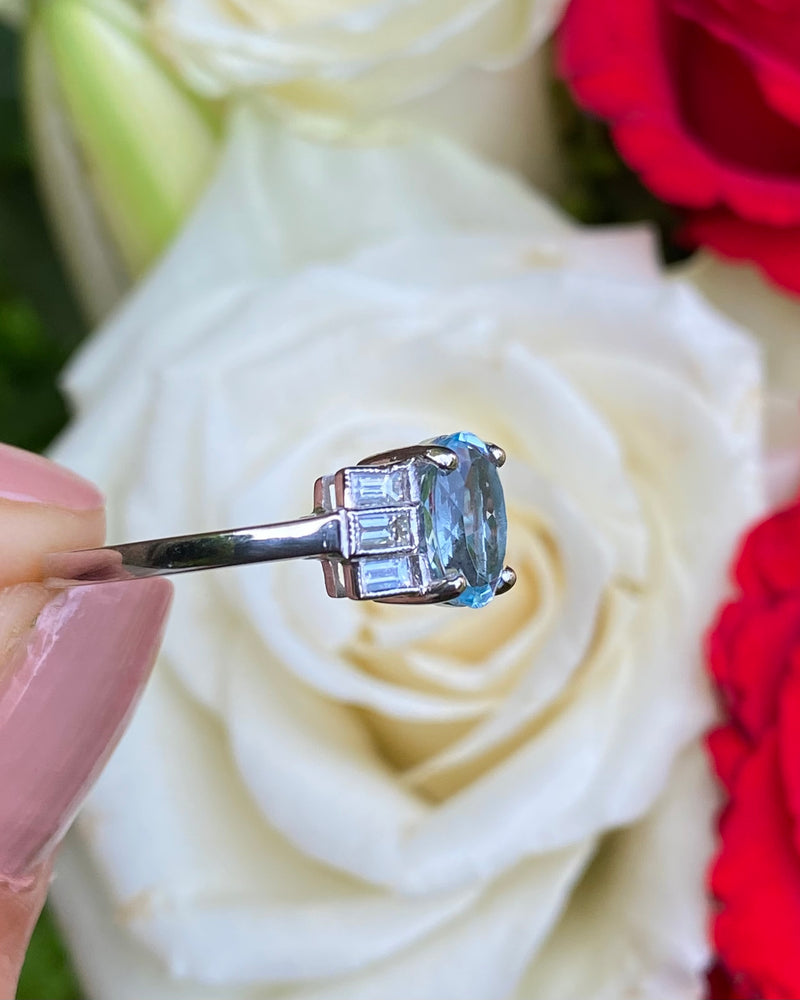 A pretty Art Deco style Aquamarine and Diamond ring with a fine quality Oval Cut Aquamarine with a baby blue Aquamarine. The oval Aquamarine and has been checked as weighing 1.20ct and is set with 4 claws and measures 8mm x 6mm. Set either side are three horizontally set baguette cut diamonds which weigh 0.35ct in total. The diamonds are rub over set, H colour and VS/SI clarity and all finished with fine milgrain edging. The ring is made entirely in Platinum and can easily be sized to other measurements.