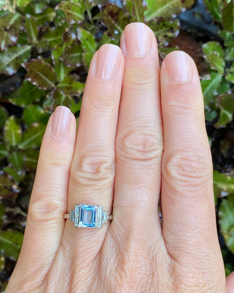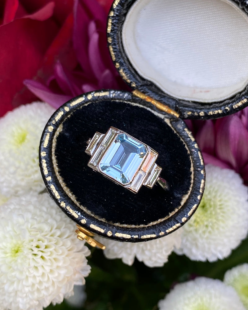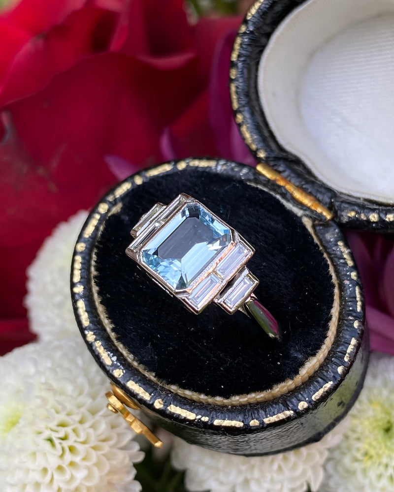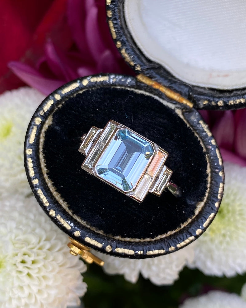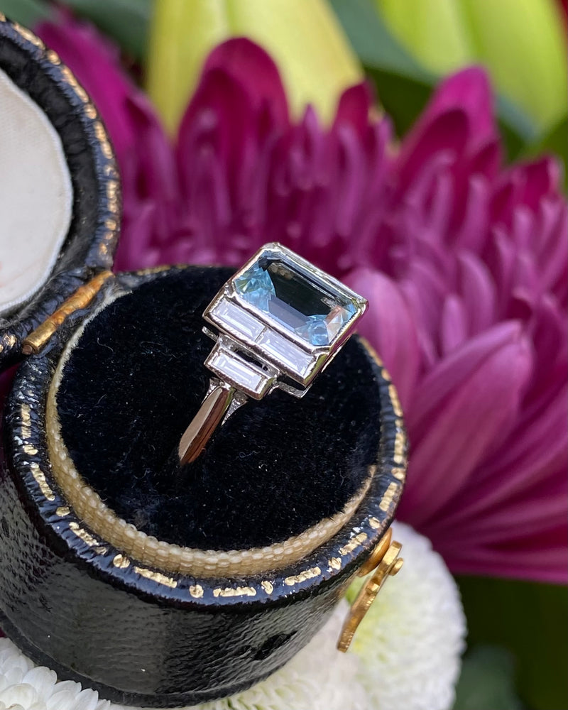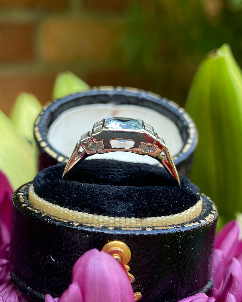 Art Deco Aquamarine and Diamond Platinum Ring 0.40ct + 1.20ct