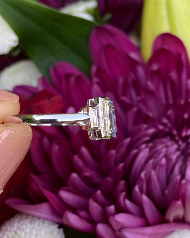 A lovely Art Deco style Aquamarine and Diamond Platinum Ring. The Central Emerald Cut Aquamarine is a beautiful sky blue colour and weighs 1.20ct, measuring 8 x 6mm and is rubover set. In addition to this spectacular Aquamarine are three Baguette Cut Diamonds stepping down either side of the ring, set in a rubover setting and finished with a fine milgrain edging. The total diamond weight is 0.40ct and the diamonds are  a wonderful H/I colour and VS/SI clarity. This ring is very special and has a truly attractive design.