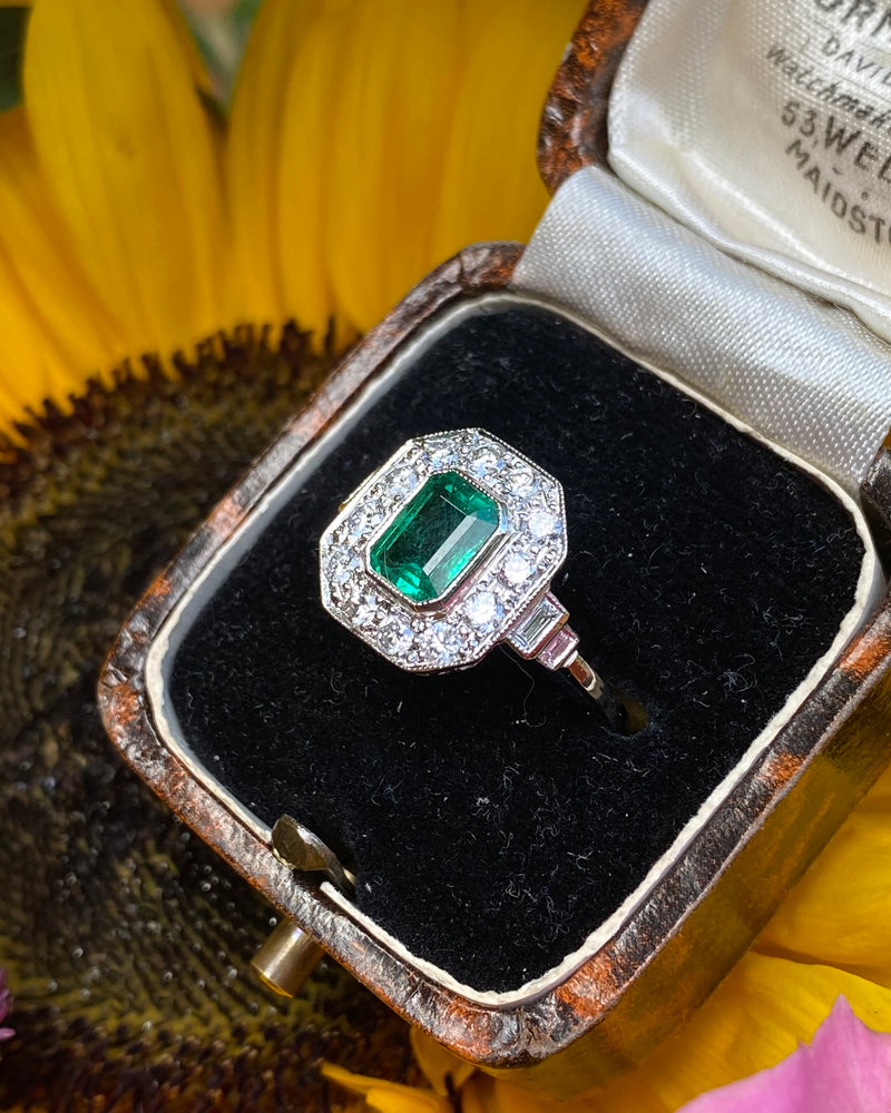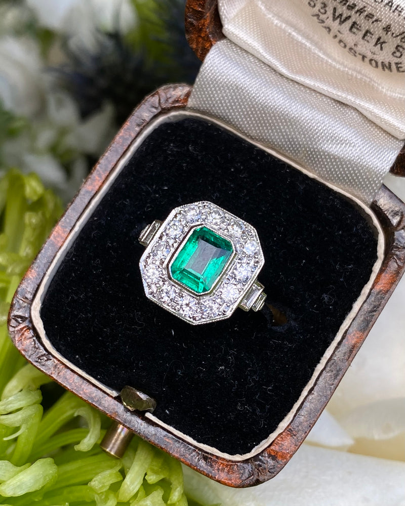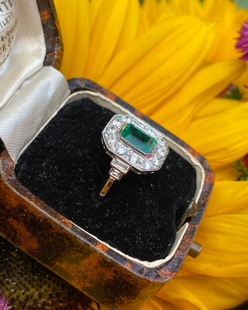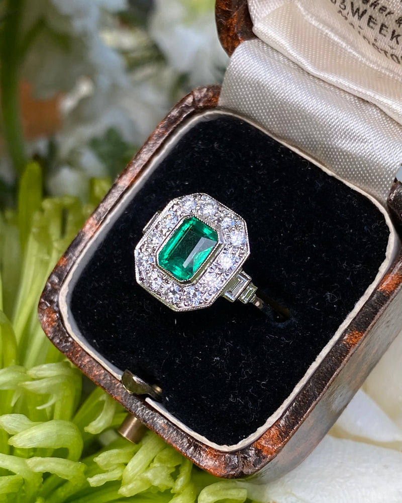 Art Deco Emerald and Diamond Cluster Platinum Ring 0.70ct + 0.90ct