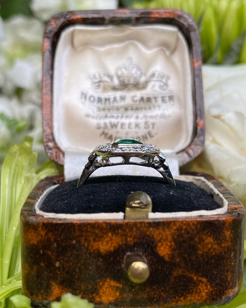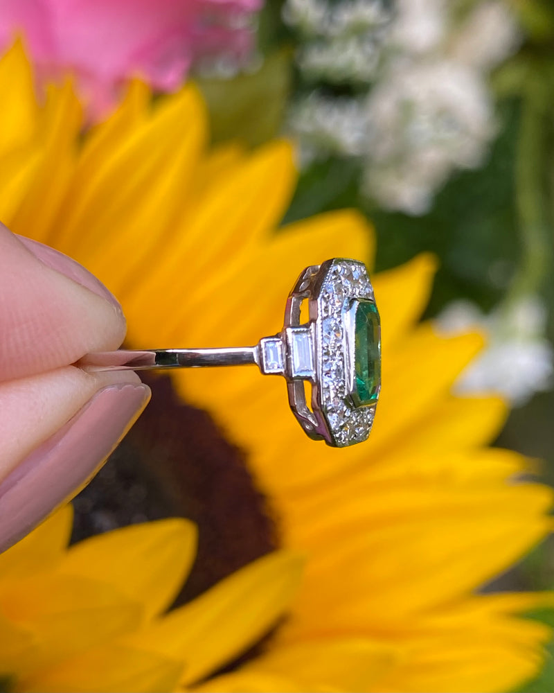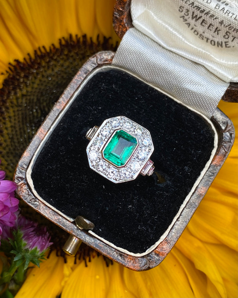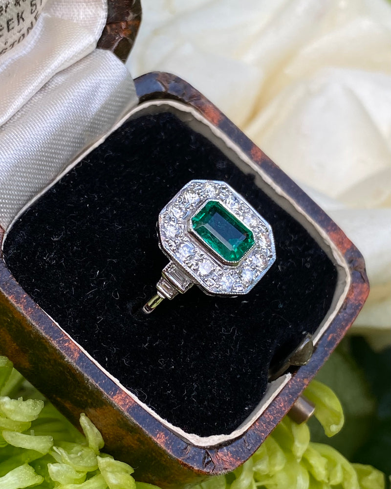 Art Deco Emerald and Diamond Cluster Platinum Ring 0.70ct + 0.90ct