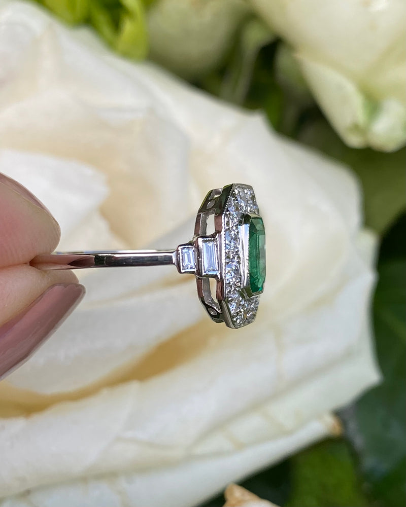 A lovely Art Deco style Emerald and Diamond Platinum Ring! The Central Emerald Cut Emerald is a gorgeous grassy green colour, with good clarity measuring 7mm x 5mm and weighs 0.90ct, set in a Rub over setting. This gorgeous Emerald is surrounded by Brilliant Cut Diamonds pave set with two additional Baguette Cut Diamonds stepping down in size, rub-over set in the shoulders of the ring, bringing the total Diamond weight to 0.70ct. The Diamonds are nice and bright H/I colour and VS/SI clarity and are all finished with fine milgrain edging. The ring sits nice and low on the finger and is easy to wear.