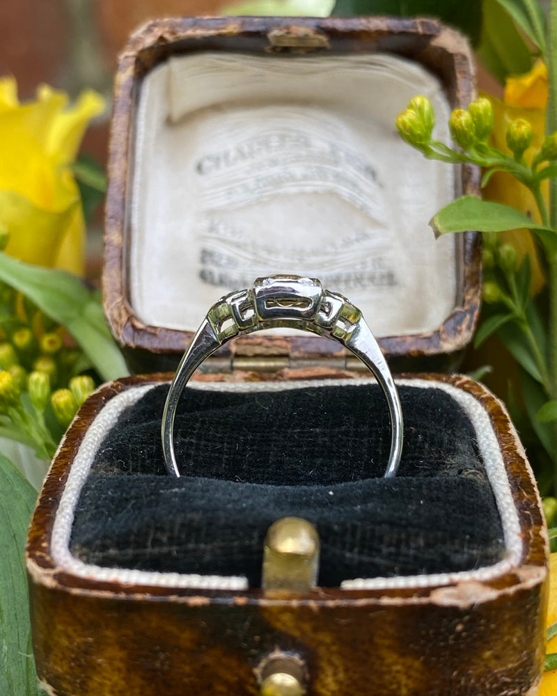 A striking Yellow Sapphire and Diamond Art Deco style Ring! The central Emerald Cut Yellow Sapphire weighs 1.30ct, a beautiful sunny and rich yellow colour and is set in a rub over setting with a fine milgrain finish and measures approximately 6.5mm by 5mm. Surrounding the Yellow Sapphire is a mixture of Round Brilliant Cut and Baguette Cut Diamonds set with a mixture rub over and pave setting. The Diamonds are of good colour and clarity, bright and full of life and are H/I colour and VS/SI clarity and the ring contains a total Diamond weight of 0.55ct. This ring sits low on the finger, is slim and elegant and made entirely in high quality, heavy Platinum.