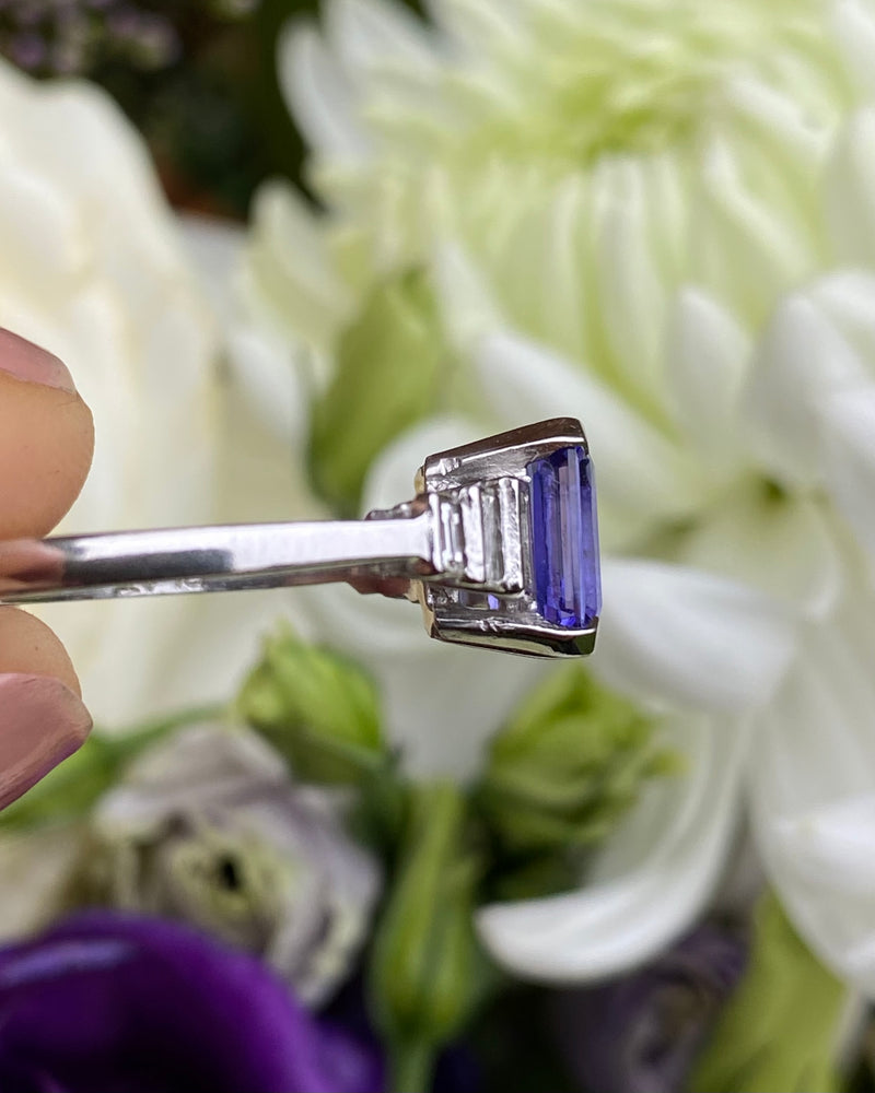 A gorgeous Art Deco style Tanzanite and Diamond Cluster Ring set in Platinum! The central Emerald Cut Tanzanite is a fabulous 1.65ct with an amazing eye catching and vibrant violet blue colour. This rare and extremely desirable stone is set with a traditional four claws and measures 8mm x 6mm. In addition to the central stone, set either side are three Baguette Cut Diamonds, graduating in size. The surrounding Diamonds weigh a total of 0.35ct are of good colour and clarity that are bright, full of life and sparkle, H/I colour and VS/SI clarity. These dazzling stones are Rubover set with a fine milgrain edging. The ring sits beautifully on the finger and is set nice and low, making it the perfect any excuse ring for any occasion!