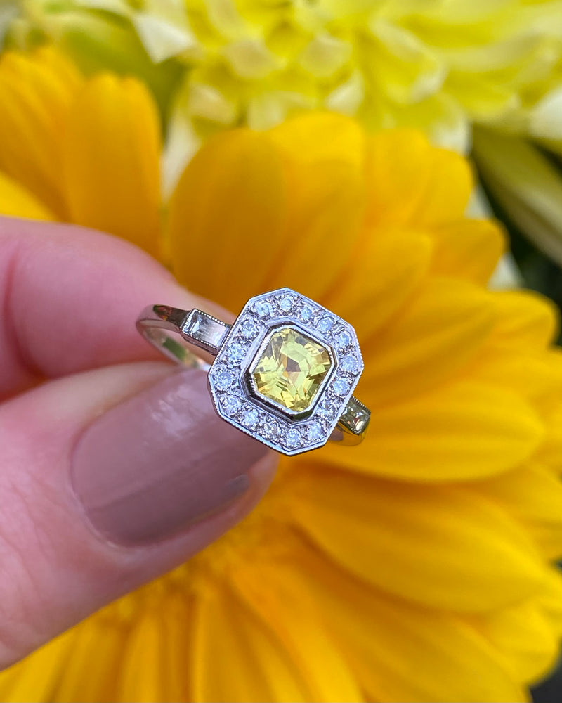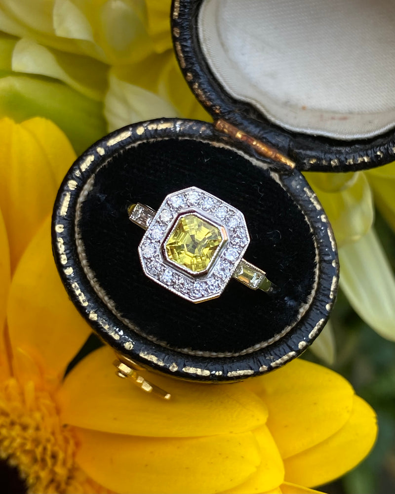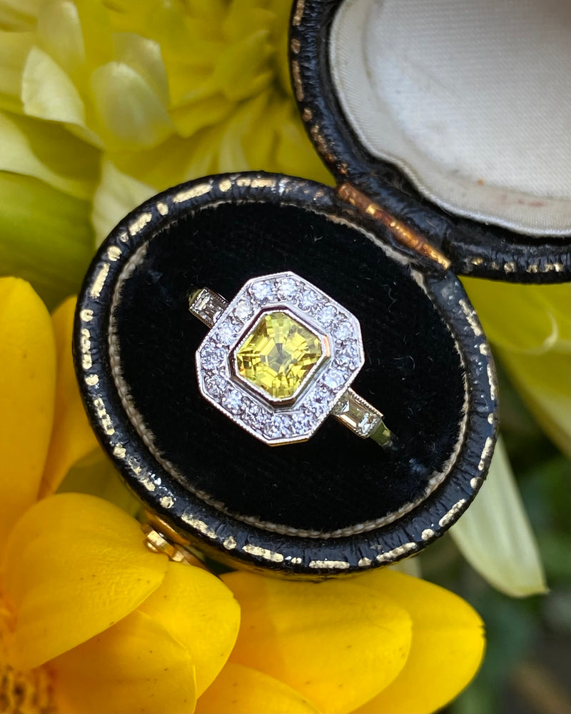 This Art Deco style Yellow Sapphire and Diamond Cluster is a beautiful ring! Sunny and vibrant, you can't help but smile wearing it. Set entirely in Platinum it looks great quality, it feels it too. The central Yellow Sapphire weighs 1.20ct measures 5.5mm x 5mm and is a lovely Emerald Cut shape. The surrounding Brilliant Cut Diamonds are pave set in an octagonal surround with an additional Baguette Cut Diamond rubover set in each shoulder, adding to the overall elegance. The Diamonds are bright and full of life, H/I colour, VS/SI clarity and weigh 0.30ct. The ring sits nice and low on the finger and is easy to wear. This is a lovely ring!