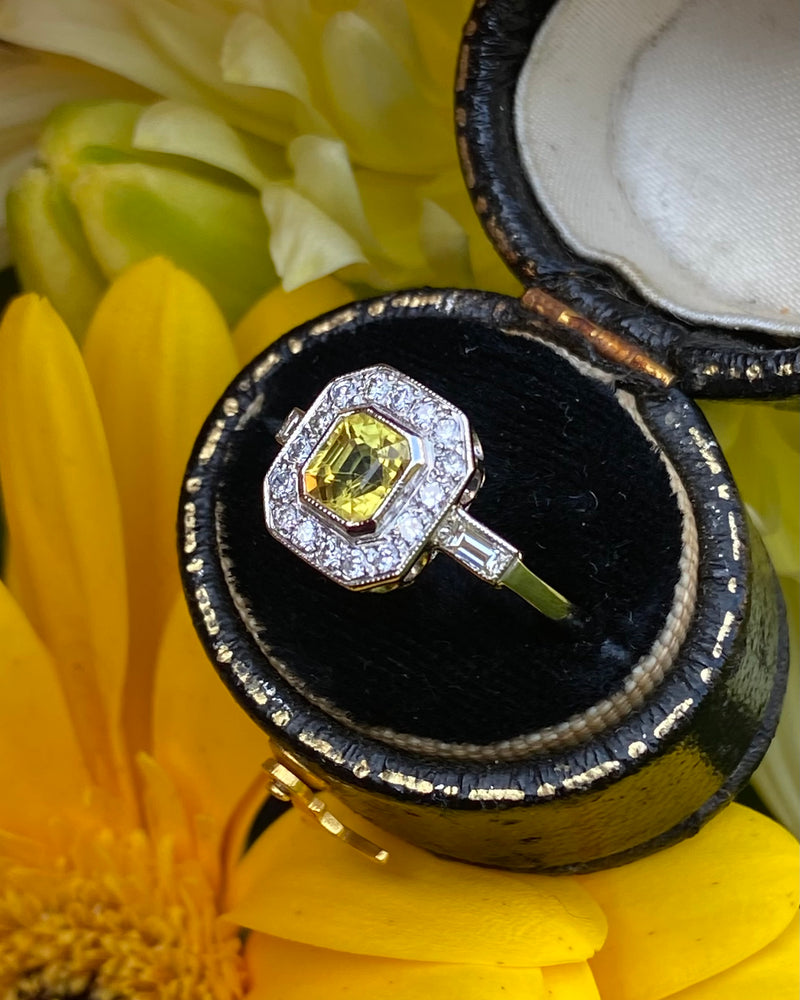 Art Deco Yellow Sapphire and Diamond Cluster Ring Platinum 0.30ct + 1.20ct