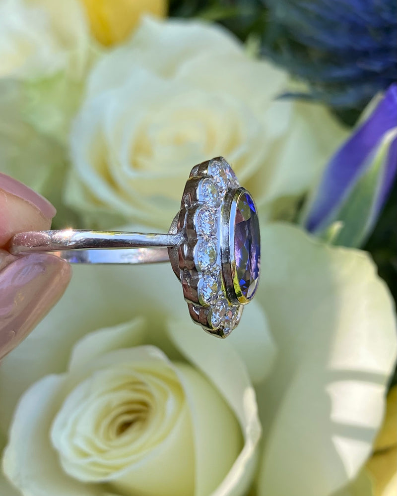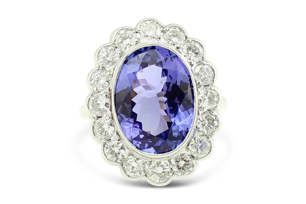 This is a fabulous Tanzanite and Diamond Cluster ring consisting of a fantastic central Oval Tanzanite surrounded by rubover set Brilliant Cut Diamonds. The Tanzanite is a rich and vibrant violet blue colour (Triple AAA), with great clarity and no abrasions or chips, measures 11mm by 9mm and weighs an impressive 3.75ct. There are fourteen substantial sized Brilliant Cut Diamonds surrounding the central Tanzanite, providing the perfect contrast to this stunning stone. All the Diamonds very bright with no visible marks to the naked eye, with a fine H/I colour and approximately ‘VS/SI’ clarity and weigh a total of 1.25ct. To complete this gorgeous design, the ring is set entirely in heavy, high quality Platinum, really complementing the Tanzanite!!