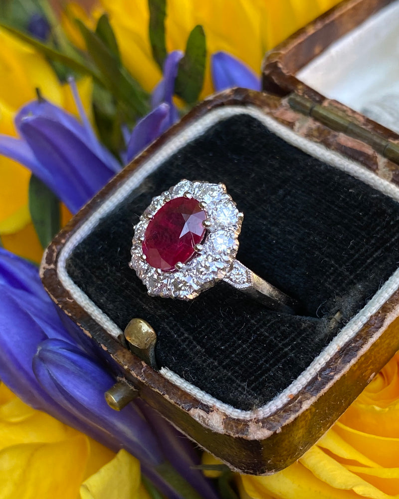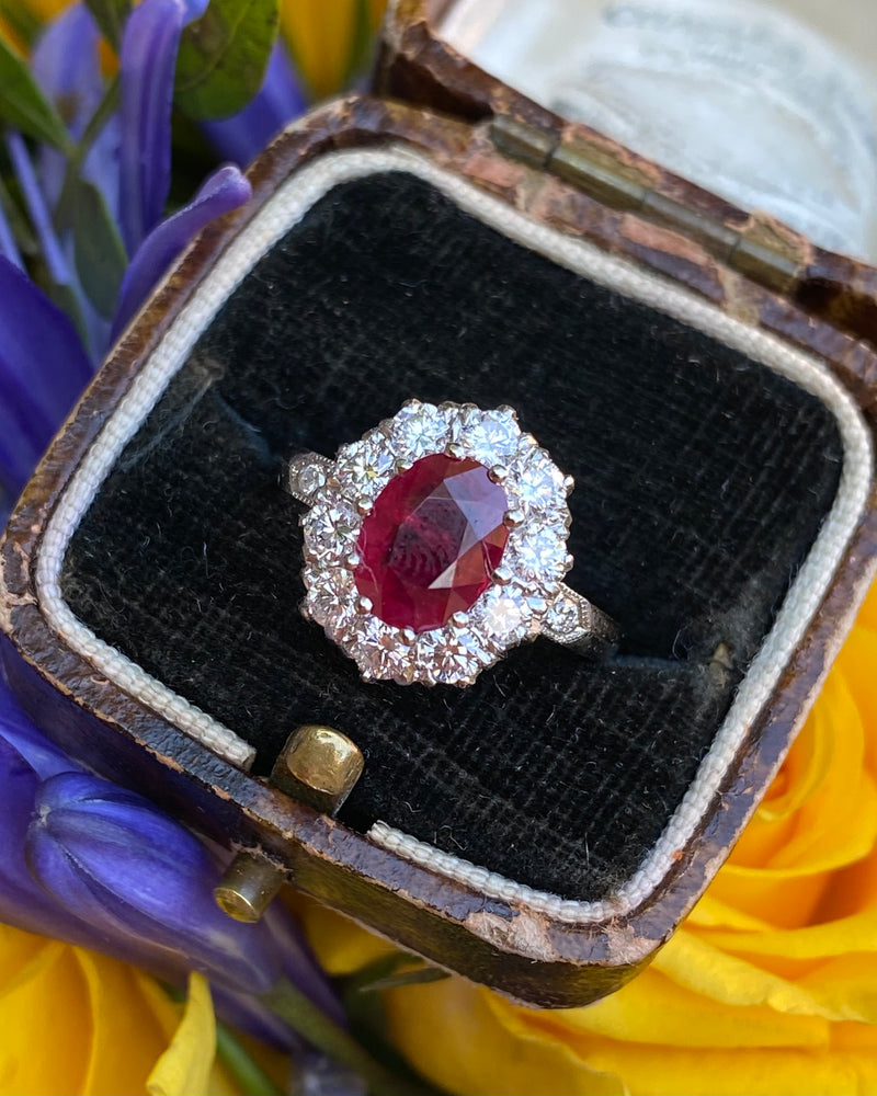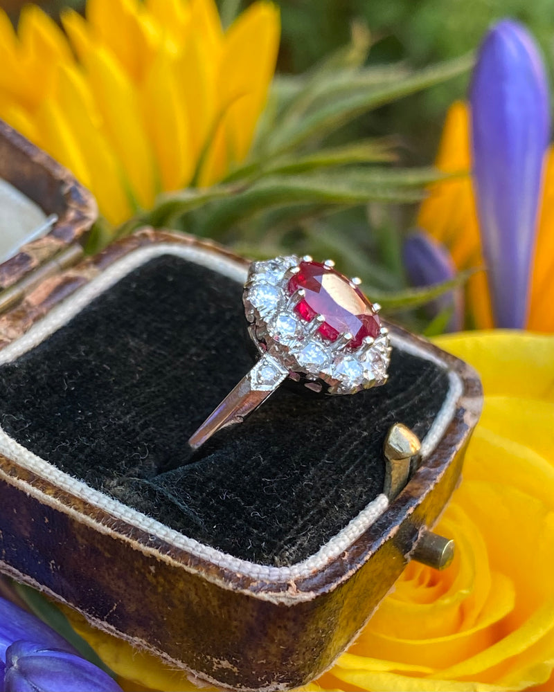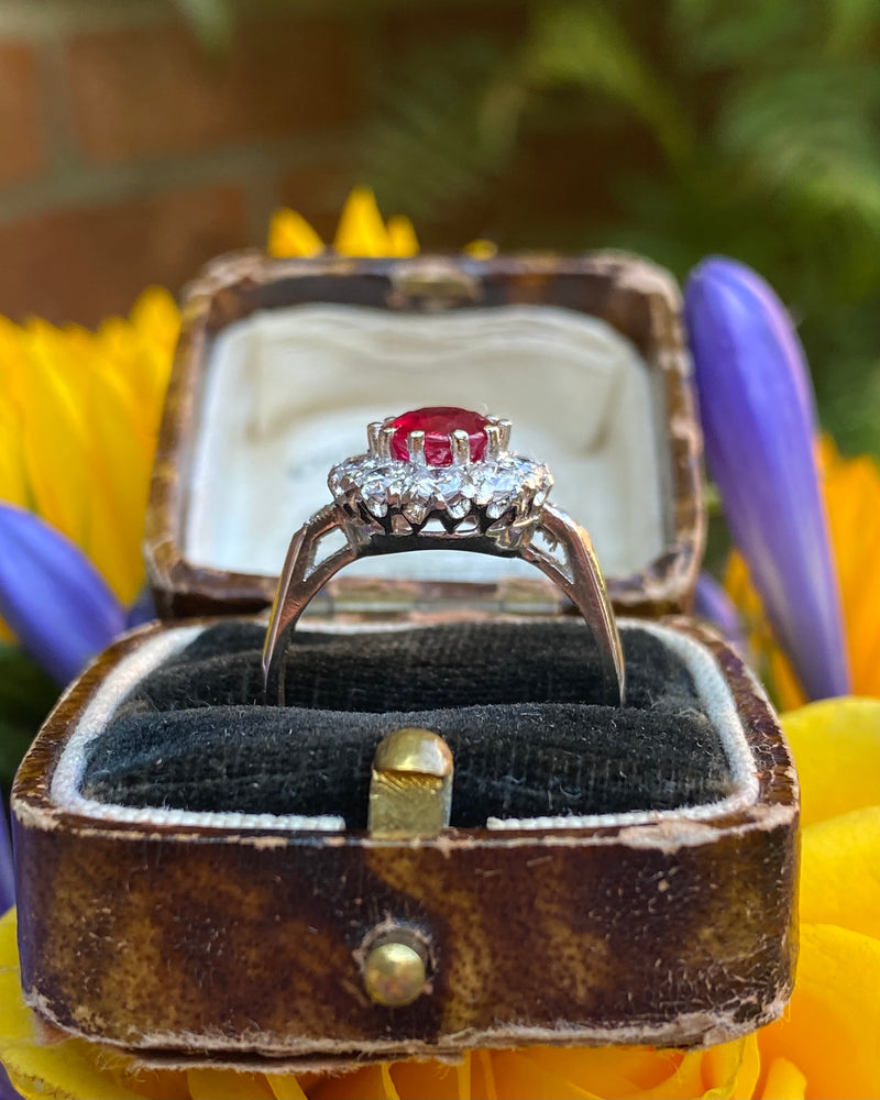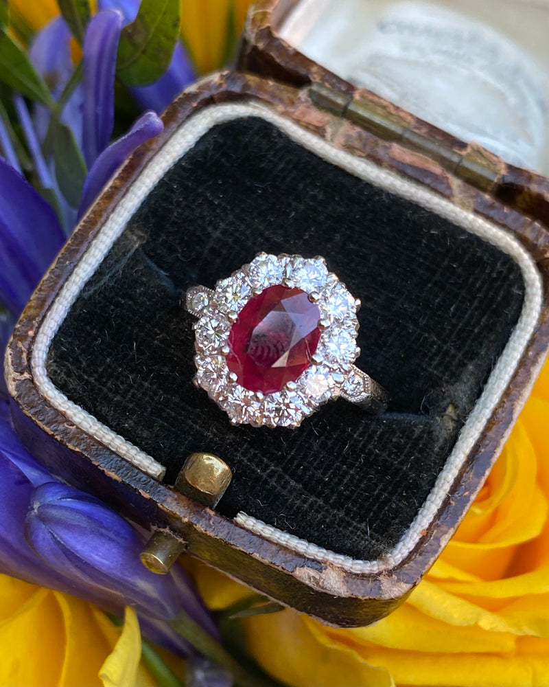 Victorian Style Ruby and Diamond Cluster Platinum Ring 0.90ct + 1.95ct