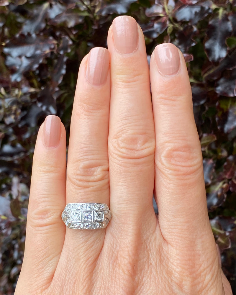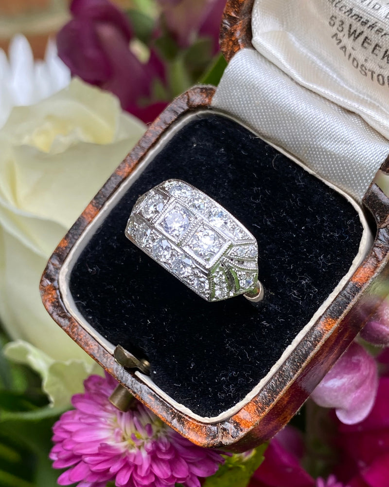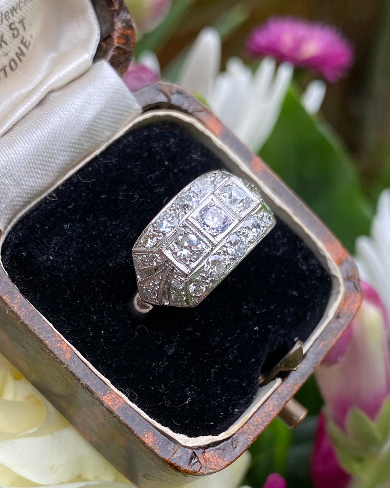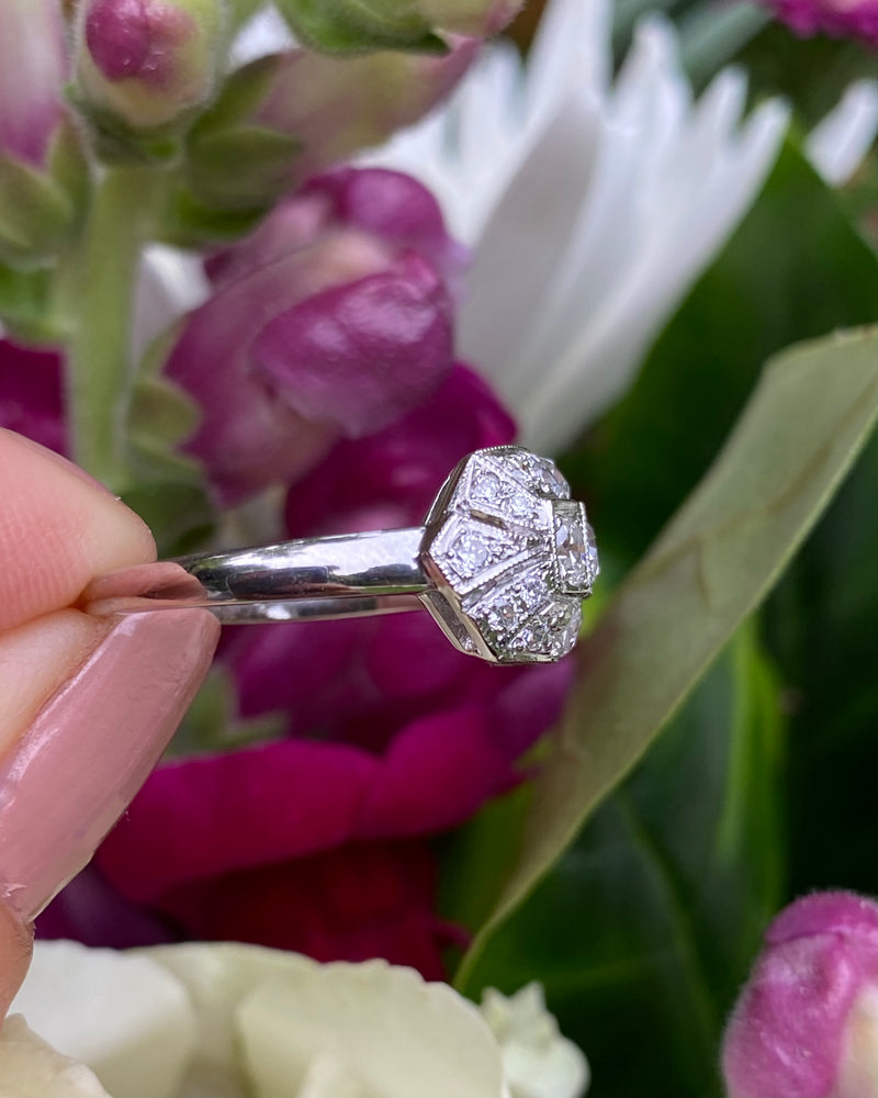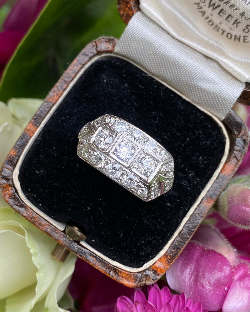 If you want bang for your buck look no further! This stunning Diamond Vintage style Bombe Cluster ring is just fabulous, filling your hand with sparkle. It has a large impressive look on the finger, created in impressive sizes and shapes and has a really interesting setting. Included in this stunning ring are three Brilliant Cut Diamonds Box set across the centre of the ring, set horizontally, with Pave set Diamonds both above and below. The cut out detailing on the side of the ring adds to the interest and the rounded bombe style shape make it easy to wear and making it sit nice and low on the finger. The Diamonds are of a fine H/I colour, VS/SI clarity and weigh a total of 1.20ct.